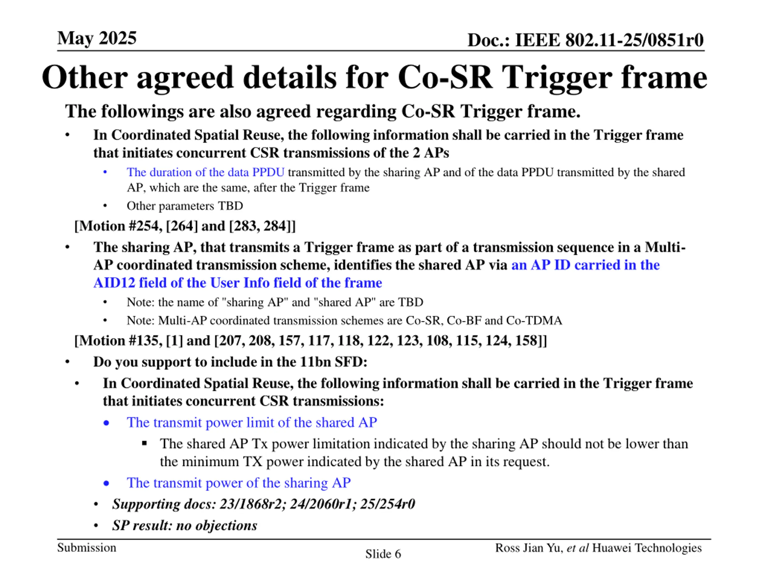 May 2025 Other agreed details for Co-SR Trigger frame The followings are also agreed regarding Co-SR Trigger frame. In Coordinated Spatial Reuse, the following information shall be carried in the Trigger frame that initiates concurrent CSR transmissions of the 2 APs The duration of the data PPDU transmitted by the sharing AP and of the data PPDU transmitted by the shared AP, which are the same, after the Trigger frame Other parameters TBD [Motion #254, [264] and [283, 284]] The sharing AP, that transmits a Trigger frame as part of a transmission sequence in a Multi- AP coordinated transmission scheme, identifies the shared AP via an AP ID carried in the AID12 field of the User Info field of the frame Note: the name of "sharing AP" and "shared AP" are TBD Note: Multi-AP coordinated transmission schemes are Co-SR, Co-BF and Co-TDMA [Motion #135, [1] and [207, 208, 157, 117, 118, 122, 123, 108, 115, 124, 158]] Do you support to include in the 11bn SFD: In Coordinated Spatial Reuse, the following information shall be carried in the Trigger frame that initiates concurrent CSR transmissions: The transmit power limit of the shared AP The shared AP Tx power limitation indicated by the sharing AP should not be lower than the minimum TX power indicated by the shared AP in its request. The transmit power of the sharing AP Supporting docs: 23/1868r2; 24/2060r1; 25/254r0 SP result: no objections Doc.: IEEE 802.11-25/0851r0 Submission Ross Jian Yu, et al Huawei Technologies Slide 6