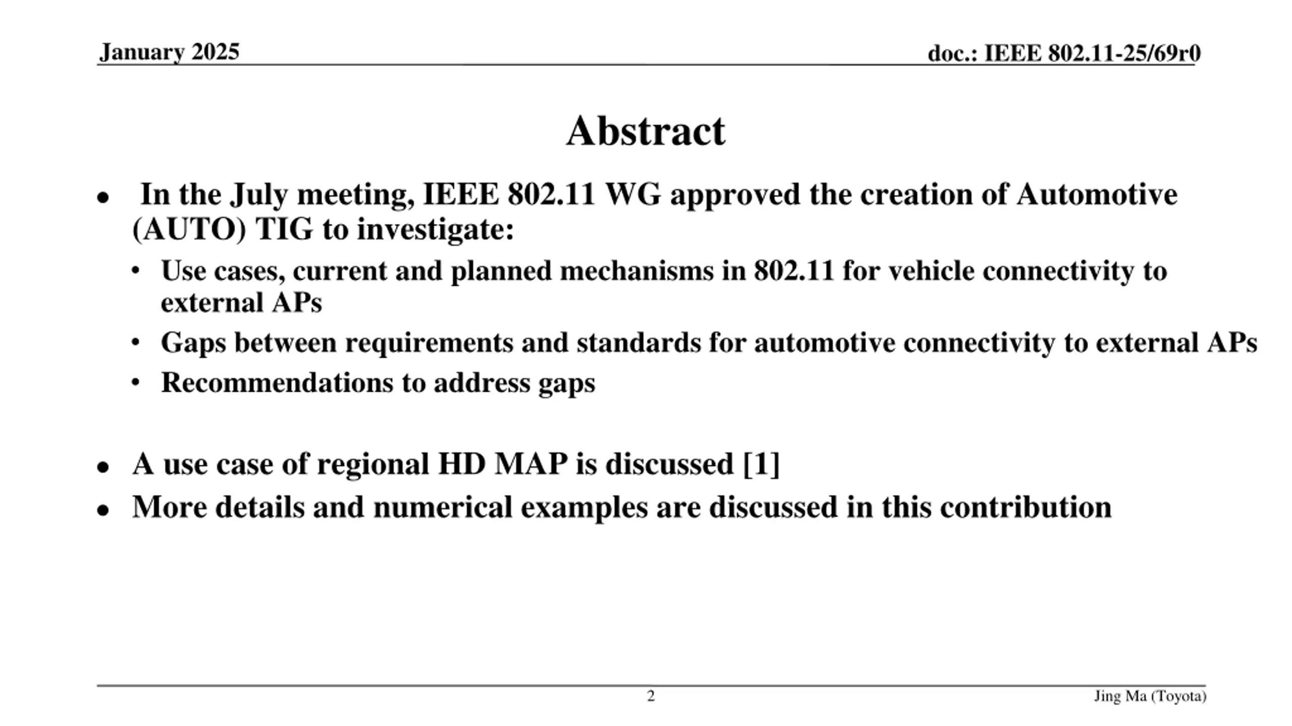 January 2025 doc.: IEEE 802.11-25/69r0 Abstract In the July meeting, IEEE 802.11 WG approved the creation of Automotive (AUTO) TIG to investigate: Use cases, current and planned mechanisms in 802.11 for vehicle connectivity to external APs Gaps between requirements and standards for automotive connectivity to external APs Recommendations to address gaps A use case of regional HD MAP is discussed [1] More details and numerical examples are discussed in this contribution 2 Jing Ma (Toyota)