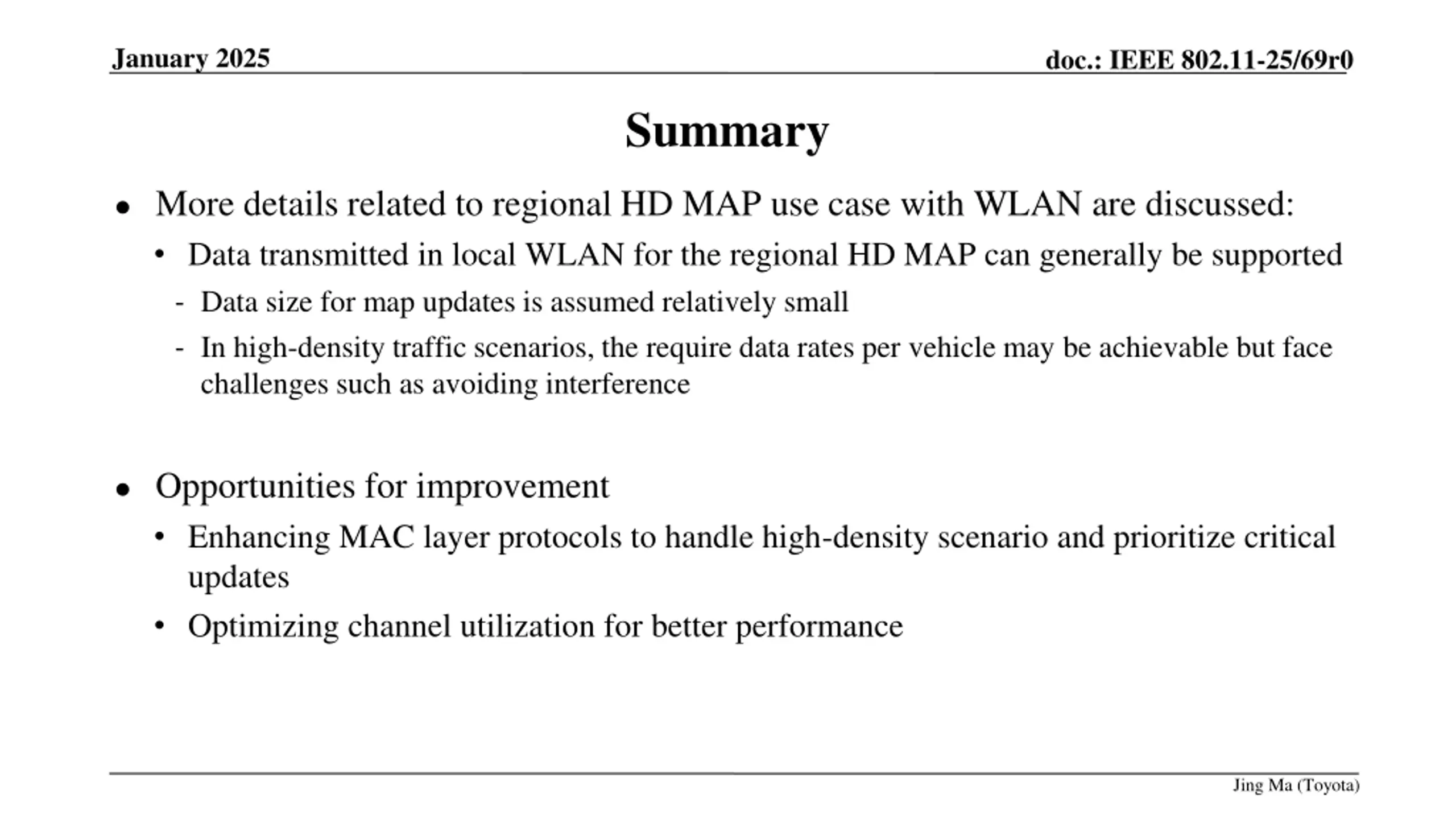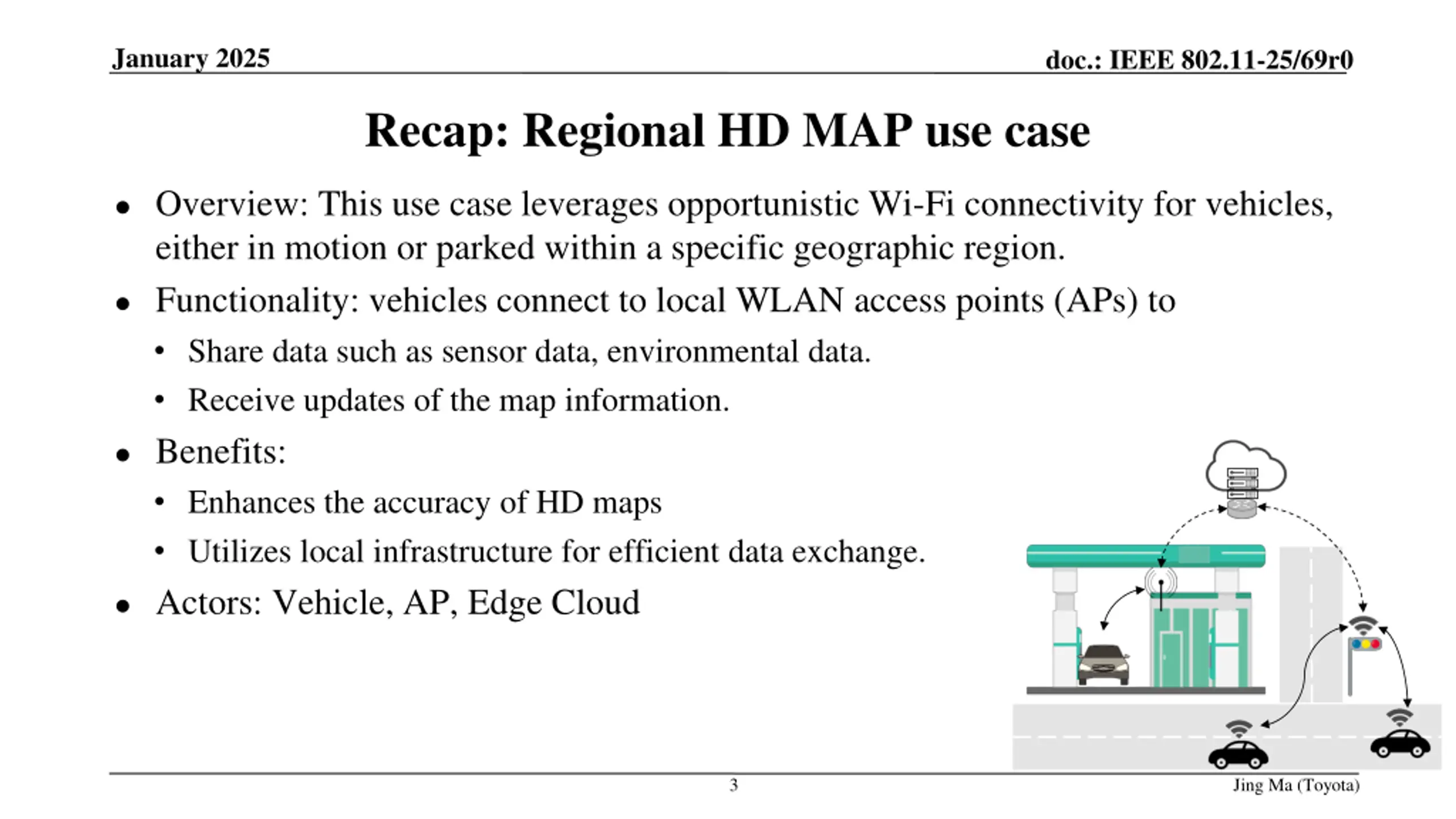 Explore the follow-up of an automotive use case study presented in January 2025 by Jing Ma from Toyota Motor Corporation. The study focuses on regional HD MAP utilization, leveraging Wi-Fi connectivity for vehicles to enhance map accuracy and data exchange efficiency.