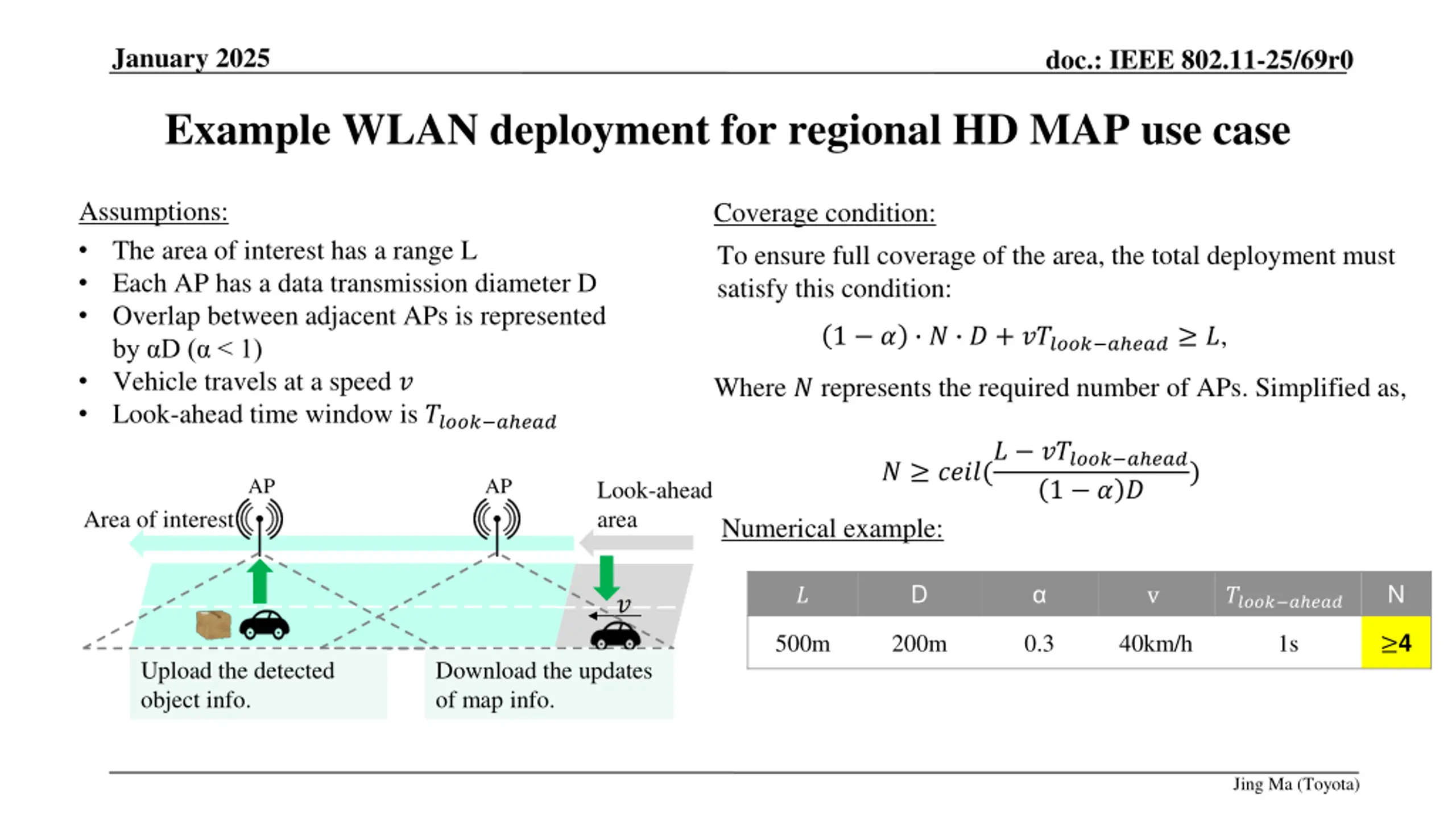 January 2025 doc.: IEEE 802.11-25/69r0 Example WLAN deployment for regional HD MAP use case Assumptions: Coverage condition: The area of interest has a range L Each AP has a data transmission diameter D Overlap between adjacent APs is represented by D ( < 1) Vehicle travels at a speed ? Look-ahead time window is ????? ? ??? To ensure full coverage of the area, the total deployment must satisfy this condition: 1 ? ? ? + ?????? ? ??? ?, Where ? represents the required number of APs. Simplified as, ? ????(? ?????? ? ??? ) AP AP Look-ahead area 1 ? ? Area of interest Numerical example: D N ? v ????? ? ??? ? 4 500m 200m 0.3 40km/h 1s Upload the detected object info. Download the updates of map info. Jing Ma (Toyota)