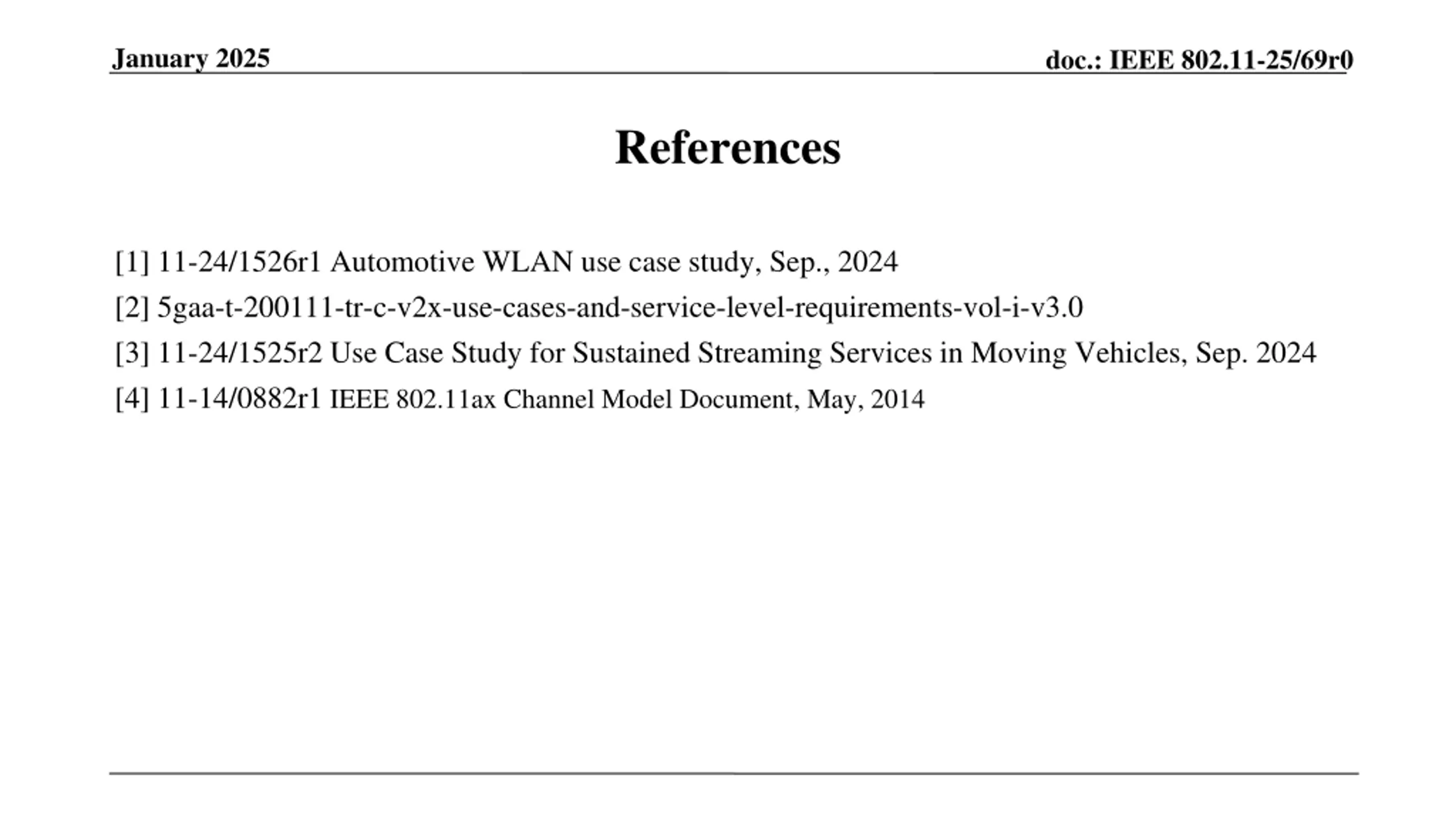 January 2025 doc.: IEEE 802.11-25/69r0 References [1] 11-24/1526r1 Automotive WLAN use case study, Sep., 2024 [2] 5gaa-t-200111-tr-c-v2x-use-cases-and-service-level-requirements-vol-i-v3.0 [3] 11-24/1525r2 Use Case Study for Sustained Streaming Services in Moving Vehicles, Sep. 2024 [4] 11-14/0882r1 IEEE 802.11ax Channel Model Document, May, 2014