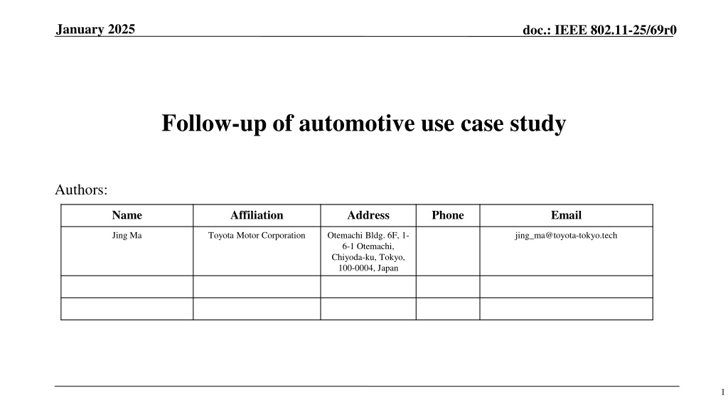 January 2025 doc.: IEEE 802.11-25/69r0 Follow-up of automotive use case study Authors: Name Affiliation Address Phone Email Jing Ma Toyota Motor Corporation Otemachi Bldg. 6F, 1- 6-1 Otemachi, Chiyoda-ku, Tokyo, 100-0004, Japan jing_ma@toyota-tokyo.tech 1