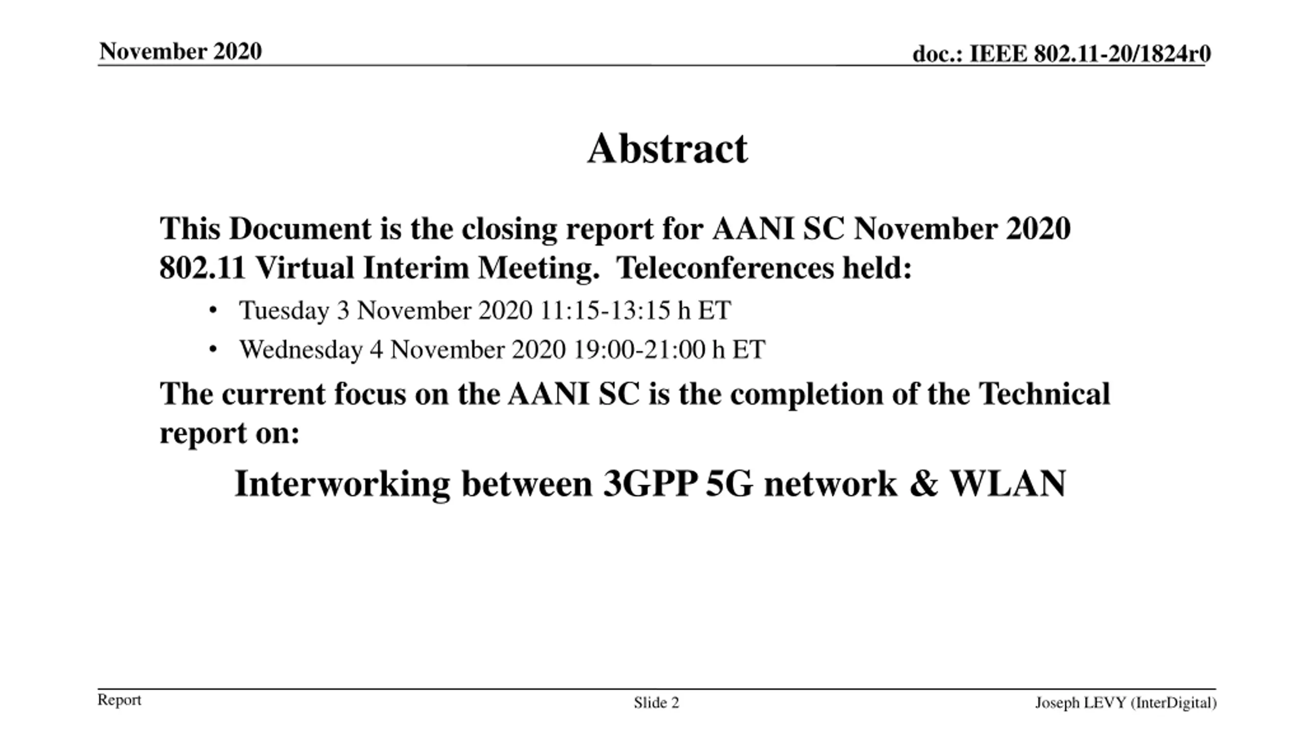 November 2020 doc.: IEEE 802.11-20/1824r0 Abstract Abstract This Document is the closing report for AANI SC November 2020 802.11 Virtual Interim Meeting. Teleconferences held: This Document is the closing report for AANI SC, November 2016 Meeting in San Antonio, TX Tuesday 3 November 2020 11:15-13:15 h ET Wednesday 4 November 2020 19:00-21:00 h ET The current focus on the AANI SC is the completion of the Technical report on: Interworking between 3GPP 5G network & WLAN Report Slide 2 Joseph LEVY (InterDigital)