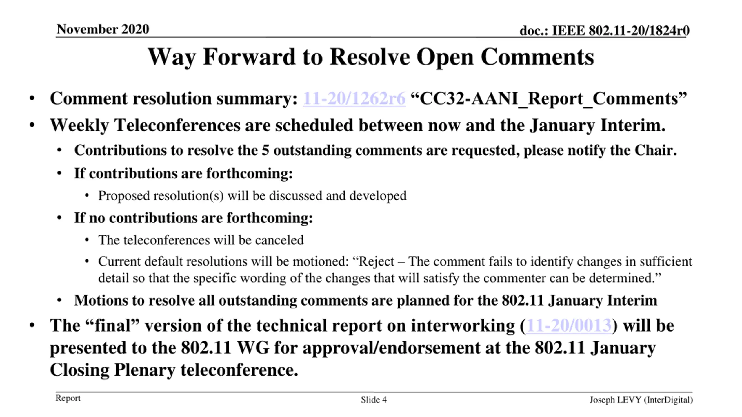 November 2020 doc.: IEEE 802.11-20/1824r0 Way Forward to Resolve Open Comments Comment resolution summary: 11-20/1262r6 CC32-AANI_Report_Comments Weekly Teleconferences are scheduled between now and the January Interim. Contributions to resolve the 5 outstanding comments are requested, please notify the Chair. If contributions are forthcoming: Proposed resolution(s) will be discussed and developed If no contributions are forthcoming: The teleconferences will be canceled Current default resolutions will be motioned: Reject The comment fails to identify changes in sufficient detail so that the specific wording of the changes that will satisfy the commenter can be determined. Motions to resolve all outstanding comments are planned for the 802.11 January Interim The final version of the technical report on interworking (11-20/0013) will be presented to the 802.11 WG for approval/endorsement at the 802.11 January Closing Plenary teleconference. Report Slide 4 Joseph LEVY (InterDigital)