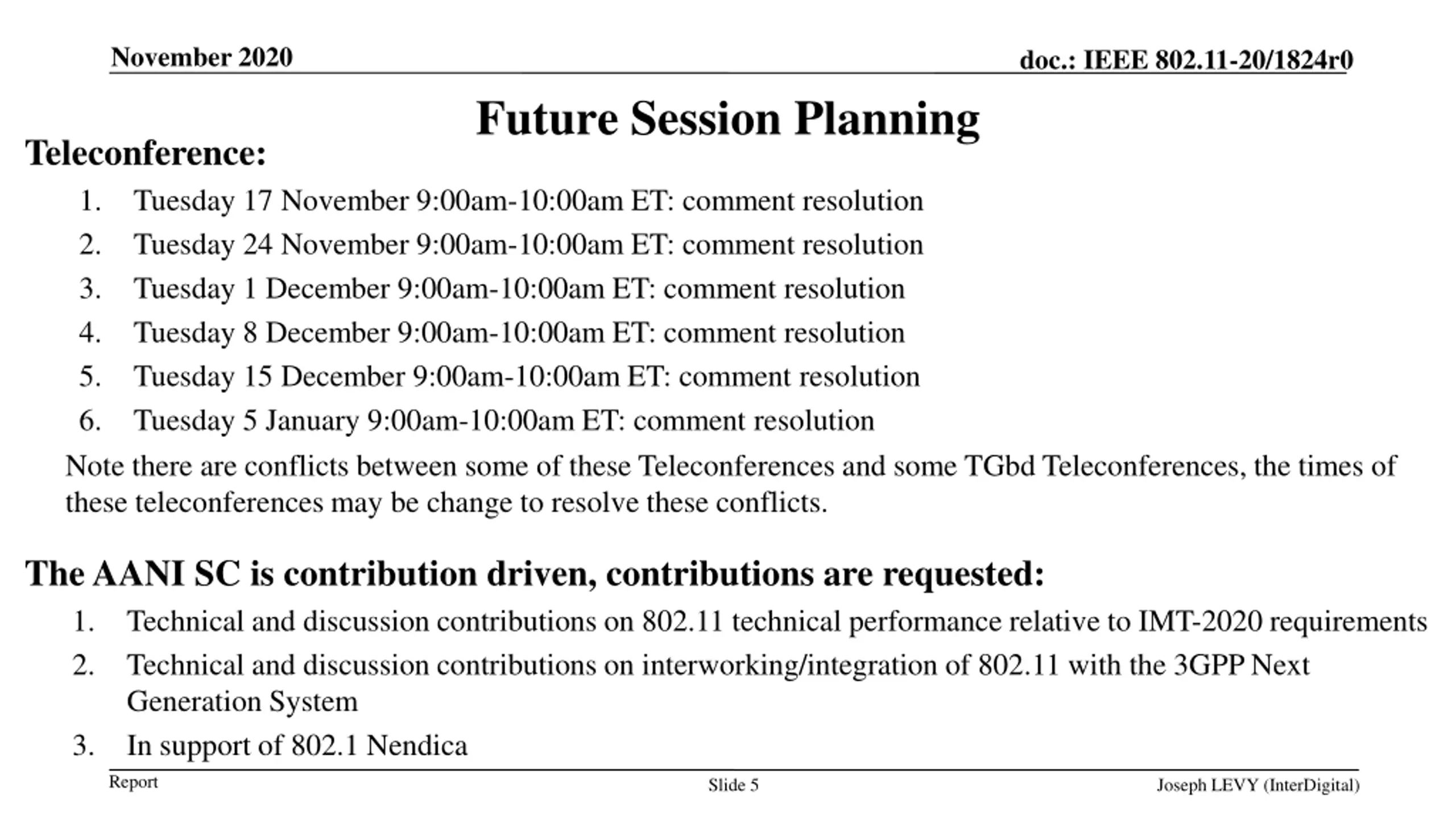 November 2020 doc.: IEEE 802.11-20/1824r0 Future Session Planning Teleconference: 1. Tuesday 17 November 9:00am-10:00am ET: comment resolution 2. Tuesday 24 November 9:00am-10:00am ET: comment resolution 3. Tuesday 1 December 9:00am-10:00am ET: comment resolution 4. Tuesday 8 December 9:00am-10:00am ET: comment resolution 5. Tuesday 15 December 9:00am-10:00am ET: comment resolution 6. Tuesday 5 January 9:00am-10:00am ET: comment resolution Note there are conflicts between some of these Teleconferences and some TGbd Teleconferences, the times of these teleconferences may be change to resolve these conflicts. The AANI SC is contribution driven, contributions are requested: 1. Technical and discussion contributions on 802.11 technical performance relative to IMT-2020 requirements 2. Technical and discussion contributions on interworking/integration of 802.11 with the 3GPP Next Generation System 3. In support of 802.1 Nendica Report Slide 5 Joseph LEVY (InterDigital)