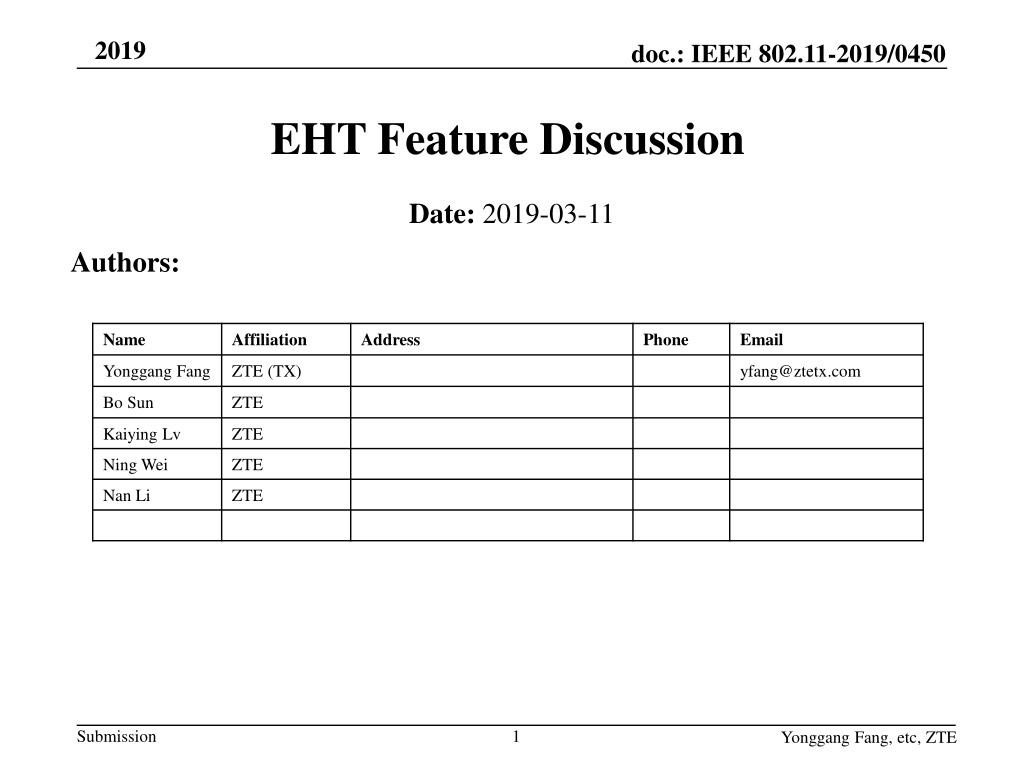 2019 doc.: IEEE 802.11-2019/0450 EHT Feature Discussion Date: 2019-03-11 Authors: Name Affiliation Address Phone Email Yonggang Fang ZTE (TX) yfang@ztetx.com Bo Sun ZTE Kaiying Lv ZTE Ning Wei ZTE Nan Li ZTE Submission 1 Yonggang Fang, etc, ZTE