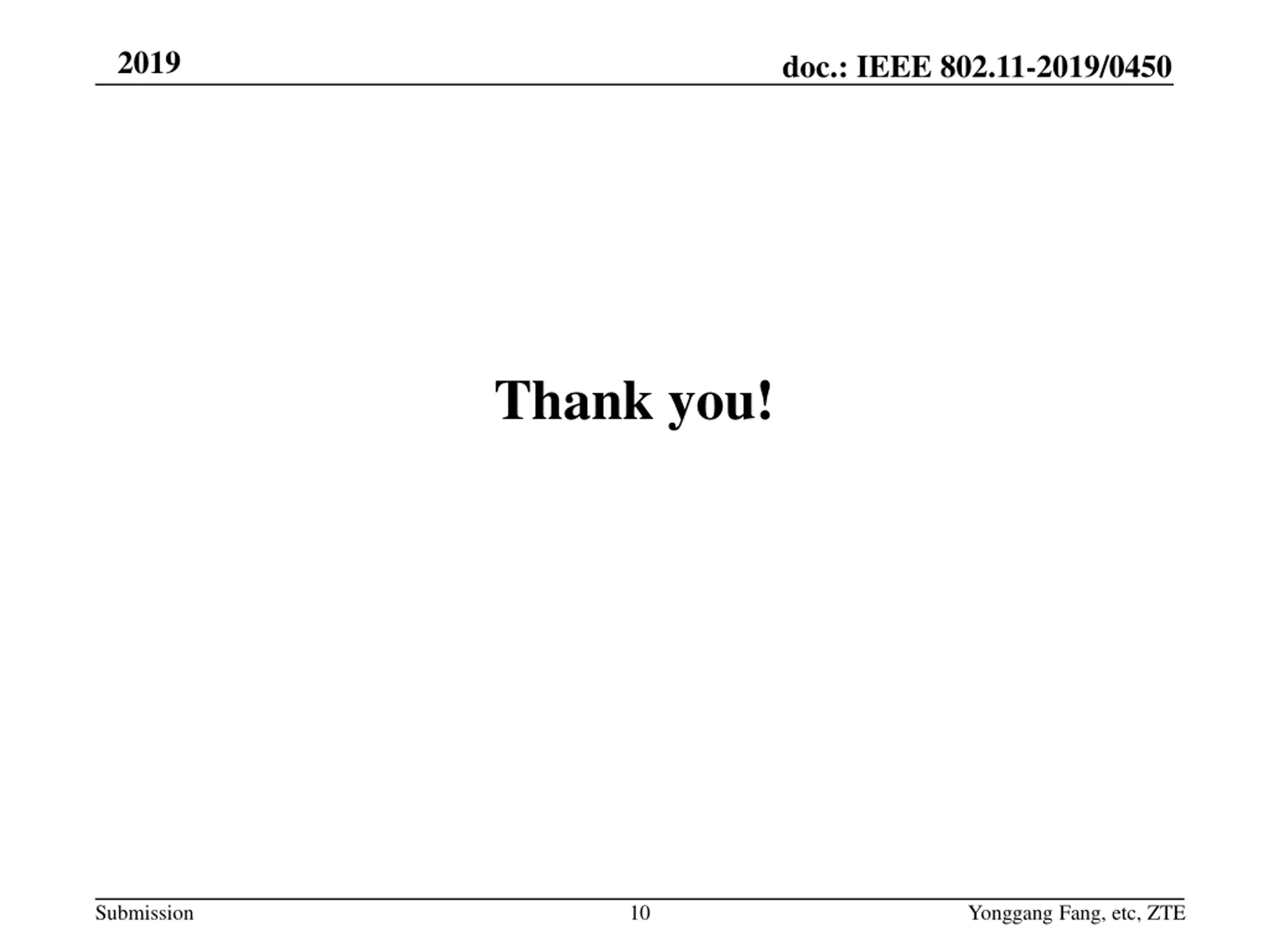 2019 doc.: IEEE 802.11-2019/0450 Thank you! Submission 10 Yonggang Fang, etc, ZTE