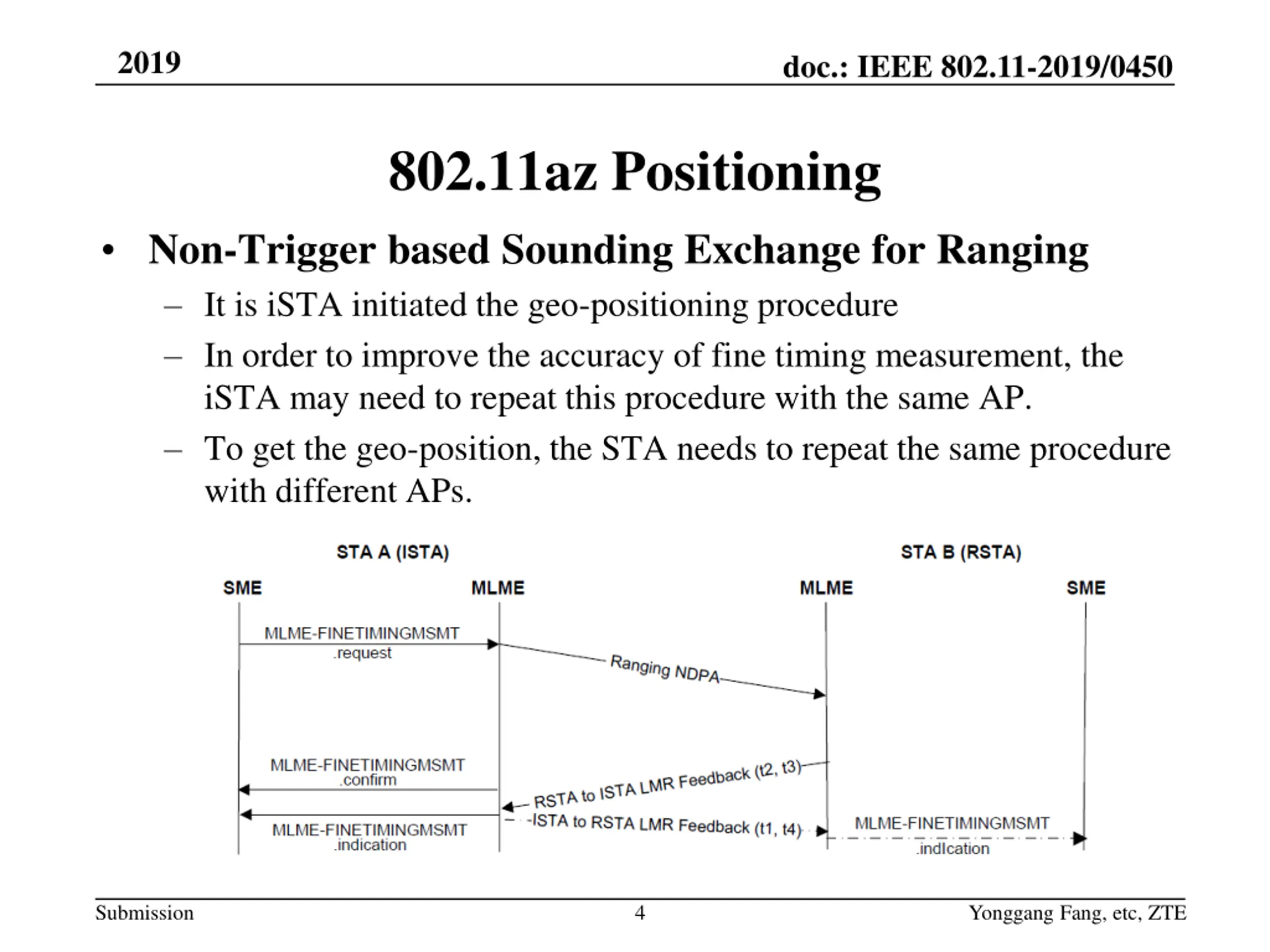 2019 doc.: IEEE 802.11-2019/0450 802.11az Positioning Non-Trigger based Sounding Exchange for Ranging It is iSTA initiated the geo-positioning procedure In order to improve the accuracy of fine timing measurement, the iSTA may need to repeat this procedure with the same AP. To get the geo-position, the STA needs to repeat the same procedure with different APs. Submission 4 Yonggang Fang, etc, ZTE