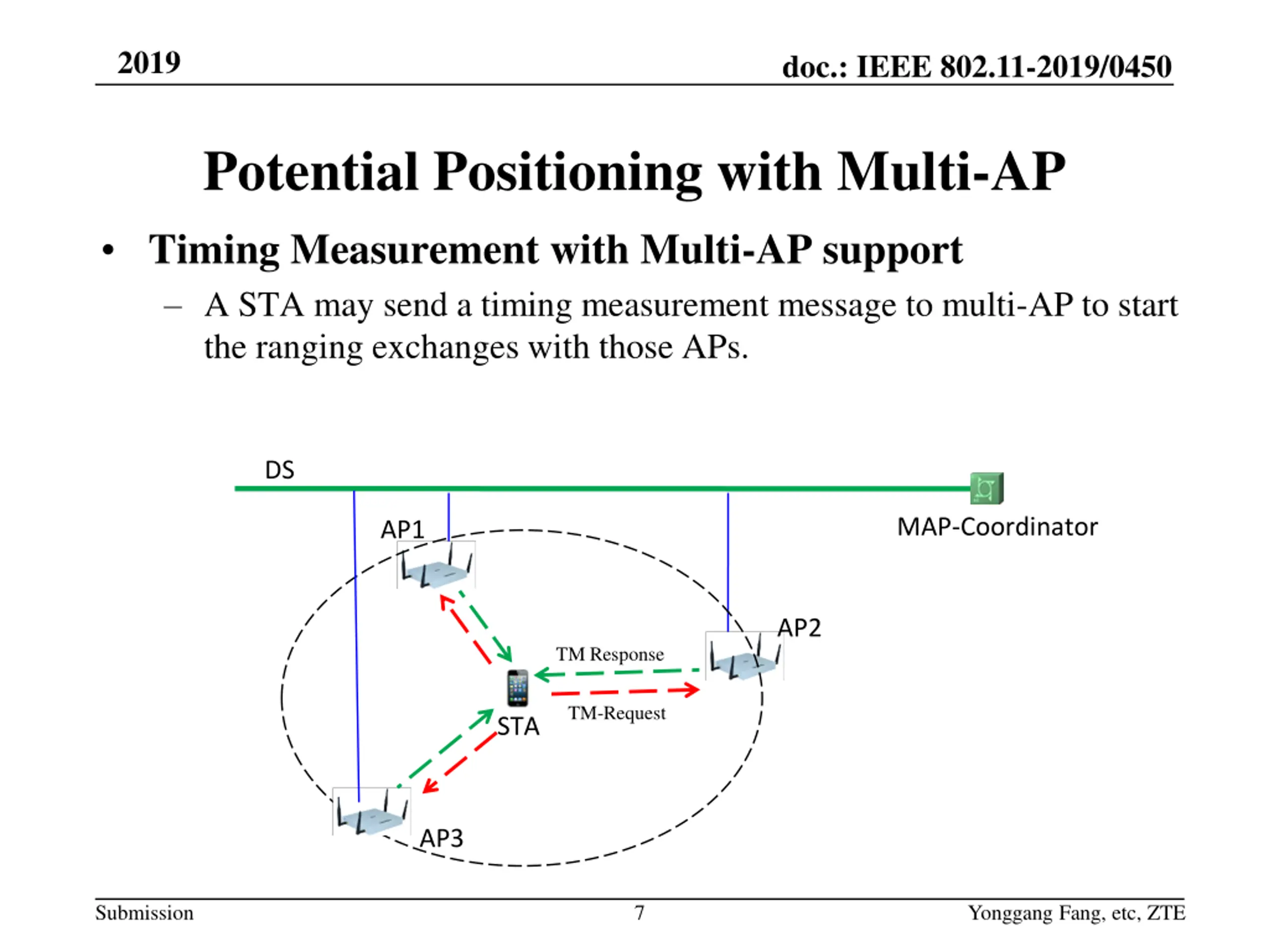 2019 doc.: IEEE 802.11-2019/0450 Analysis of Positioning Some Issues or Concerns IEEE 802.11 uses fine timing measurement to get the station s geo location. In order to get the position of the station, it requires to perform the fine timing measurement with at least 3 APs, which may take longer time when individually requesting the timing measurement with multiple APs. For the trigger-based sounding exchange procedure, it may need a coordinator to coordinate multiple APs to send trigger frames for the sounding exchanges. But how to efficiently coordinate multiple APs for sounding exchanges to reduce the measurement time might be a concern. In typical scenario, a STA may need to know its location at any time to trigger its location based services for the application software installed in the STA. Therefore non-trigger based geo-positioning would be more useful to applications running on the station. With Multi-AP support in EHT, a station may get the geo-position measured with multi-APs at anytime using the non-trigger based geo-positioning, and improve the efficiency of positioning. Submission 6 Yonggang Fang, etc, ZTE