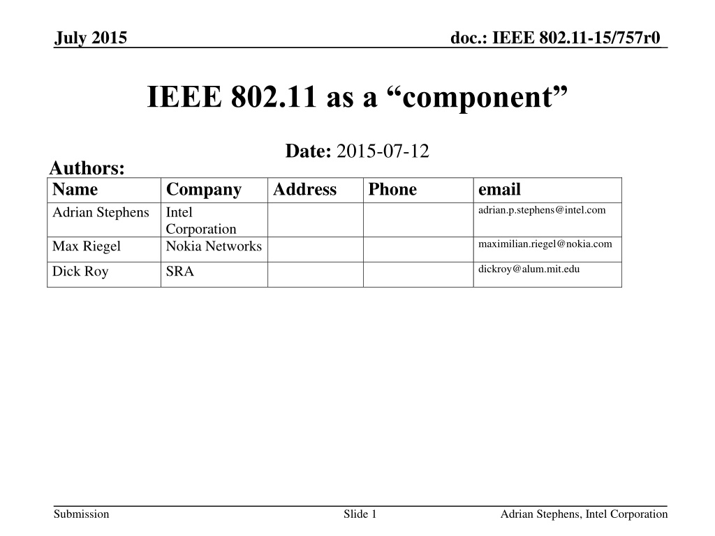 July 2015 doc.: IEEE 802.11-15/757r0 IEEE 802.11 as a component Date: 2015-07-12 Authors: Name Adrian Stephens Intel Company Address Phone email adrian.p.stephens@intel.com Corporation Nokia Networks maximilian.riegel@nokia.com Max Riegel dickroy@alum.mit.edu Dick Roy SRA Submission Slide 1 Adrian Stephens, Intel Corporation