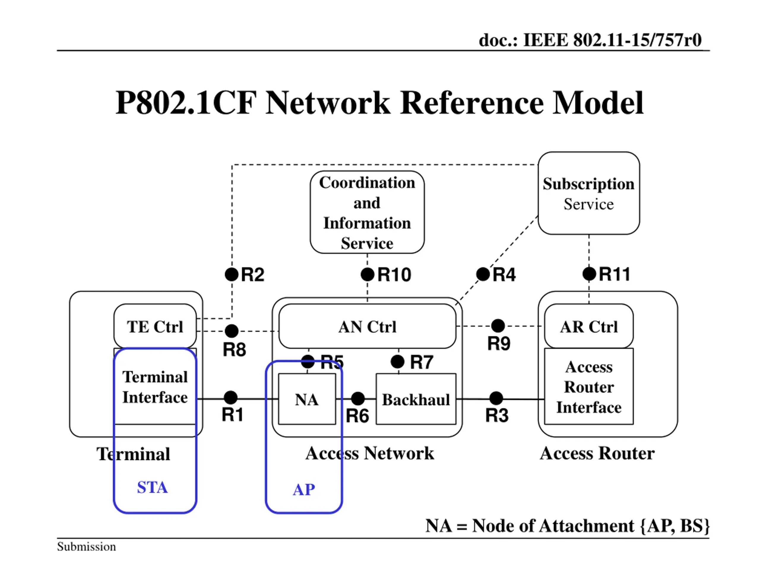 doc.: IEEE 802.11-15/757r0 P802.1CF Network Reference Model Coordination and Information Service Subscription Service R11 R2 R10 R4 TE Ctrl AN Ctrl AR Ctrl R9 R8 R5 R7 Access Router Interface Terminal Interface NA Backhaul R1 R3 R6 Access Network Access Router Terminal STA AP NA = Node of Attachment {AP, BS} Submission