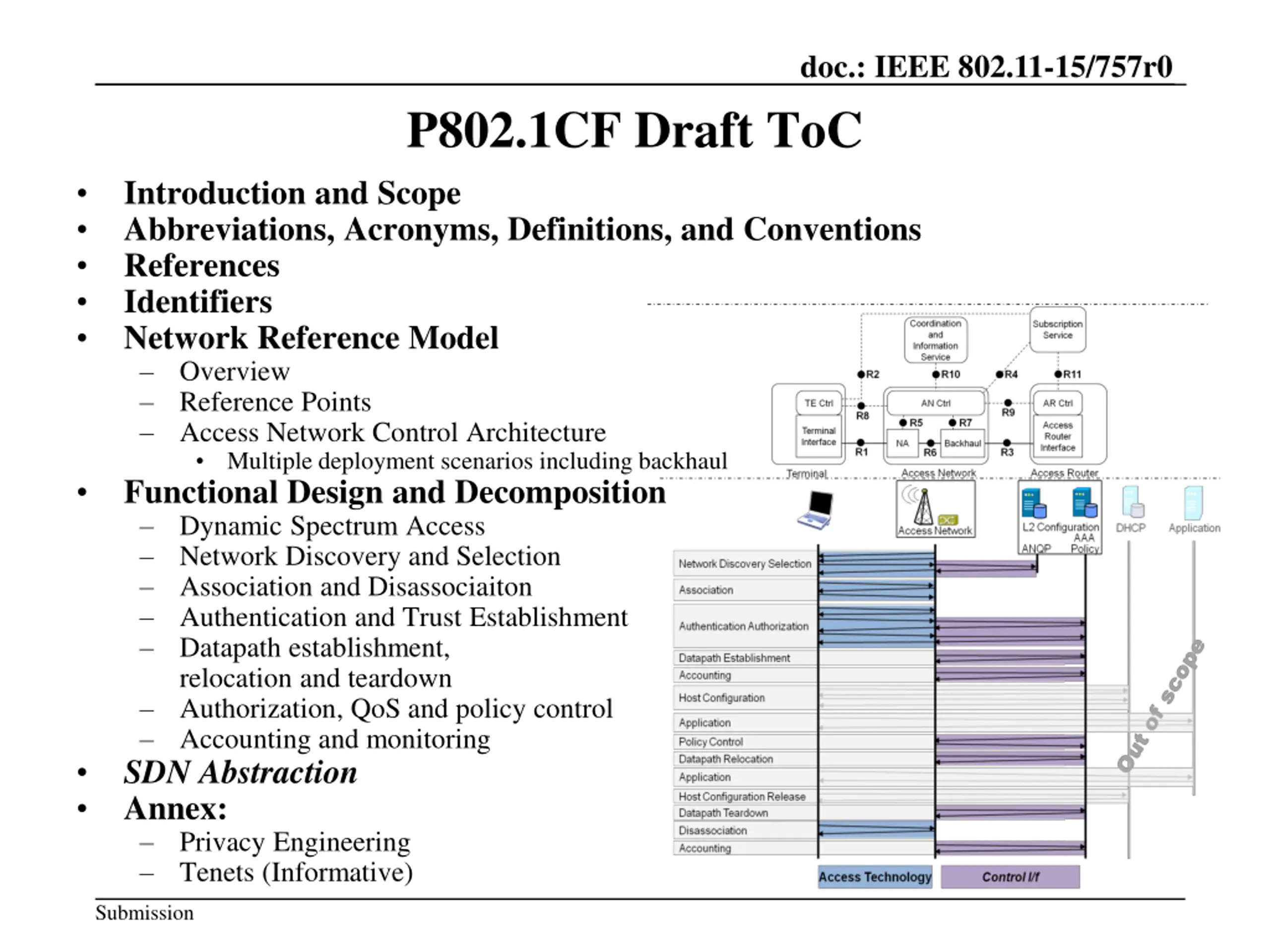 doc.: IEEE 802.11-15/757r0 P802.1CF Draft ToC Introduction and Scope Abbreviations, Acronyms, Definitions, and Conventions References Identifiers Network Reference Model Overview Reference Points Access Network Control Architecture Multiple deployment scenarios including backhaul Functional Design and Decomposition Dynamic Spectrum Access Network Discovery and Selection Association and Disassociaiton Authentication and Trust Establishment Datapath establishment, relocation and teardown Authorization, QoS and policy control Accounting and monitoring SDN Abstraction Annex: Privacy Engineering Tenets (Informative) Submission