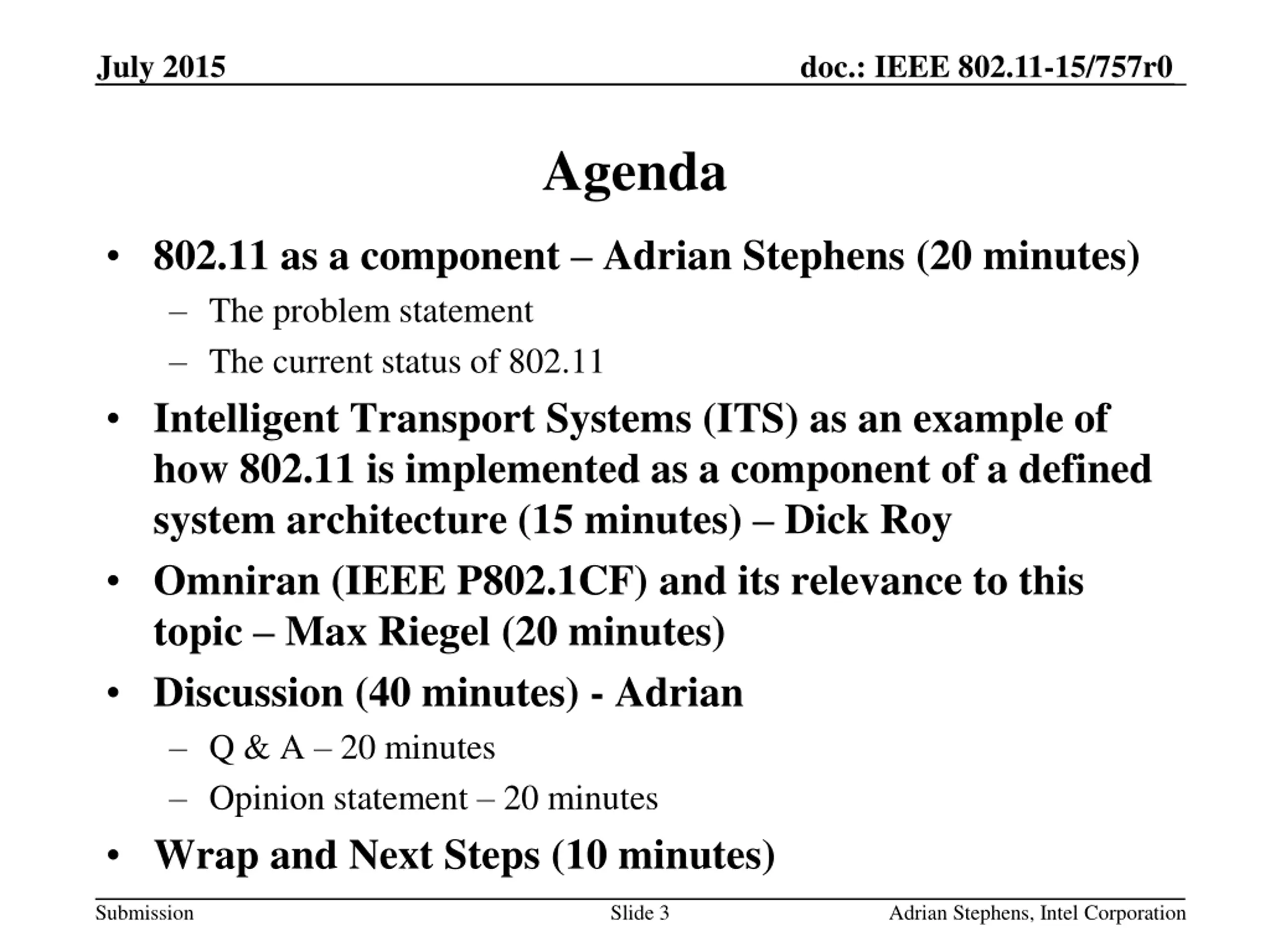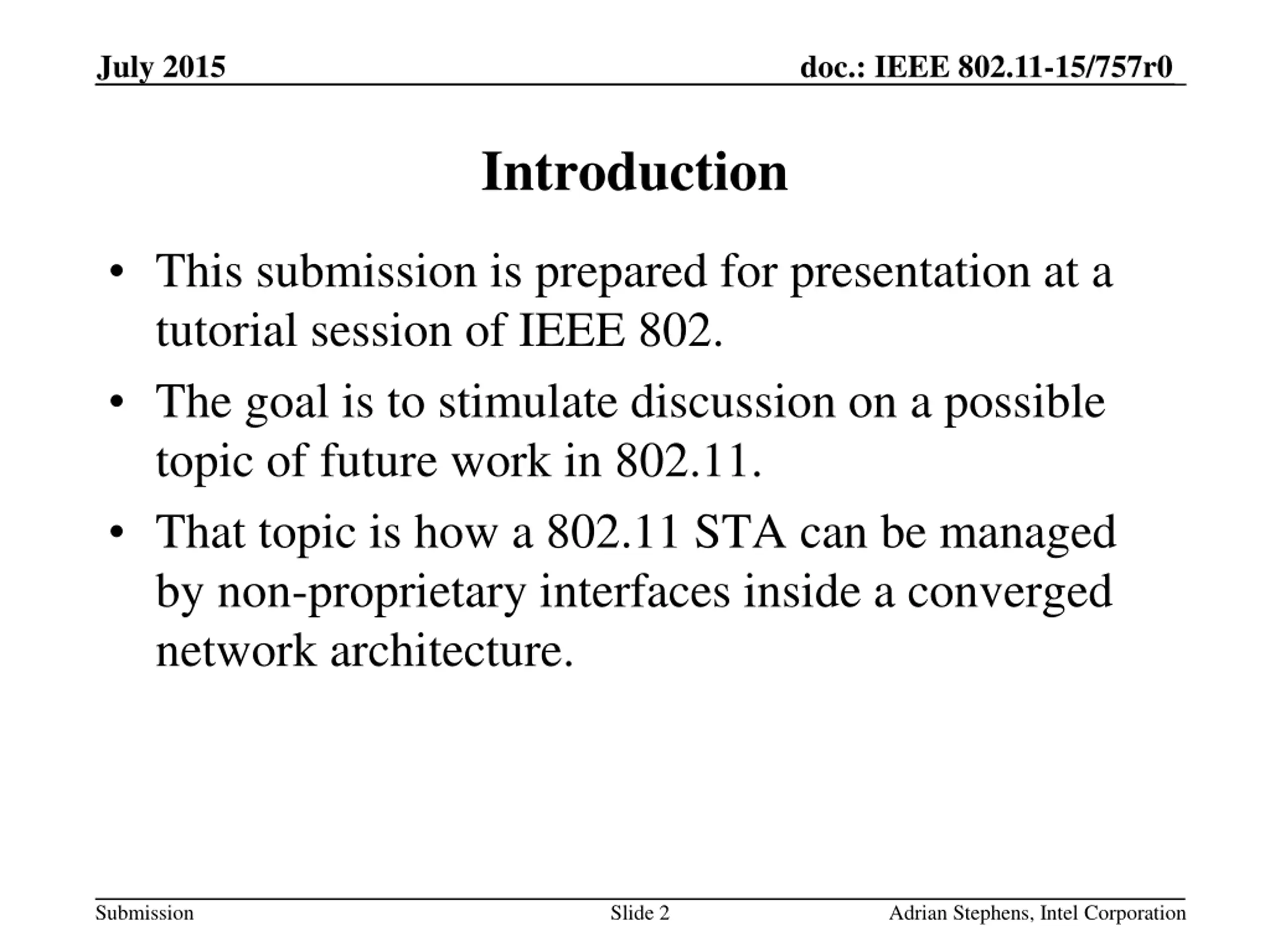 July 2015 doc.: IEEE 802.11-15/757r0 Introduction This submission is prepared for presentation at a tutorial session of IEEE 802. The goal is to stimulate discussion on a possible topic of future work in 802.11. That topic is how a 802.11 STA can be managed by non-proprietary interfaces inside a converged network architecture. Submission Slide 2 Adrian Stephens, Intel Corporation