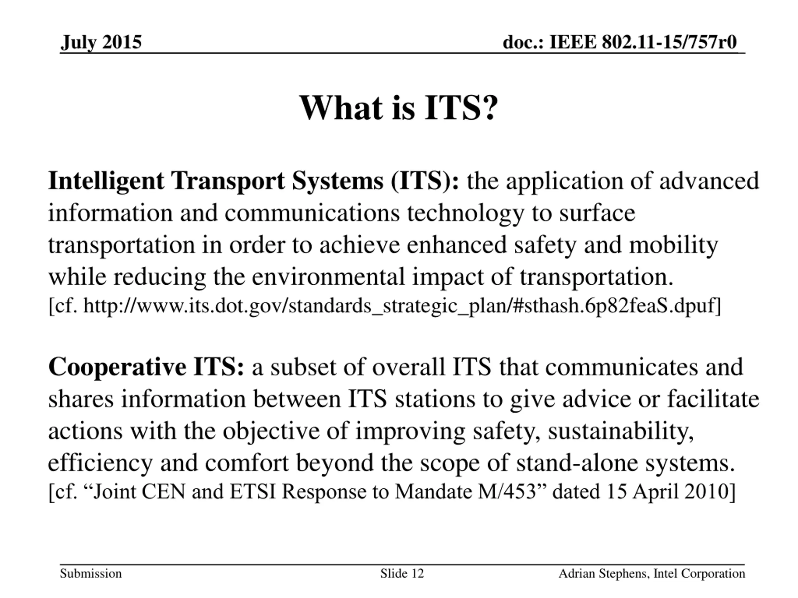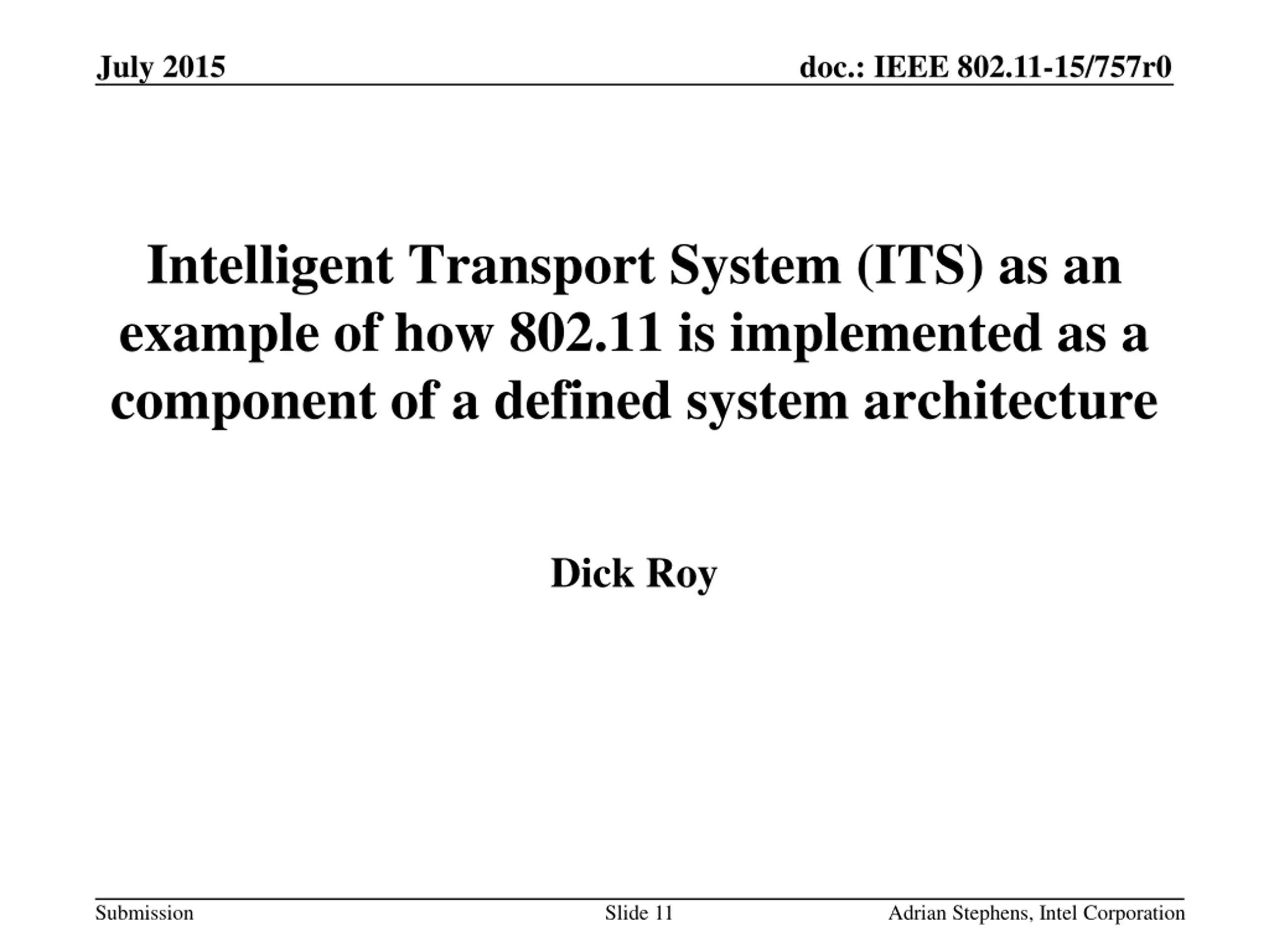 July 2015 doc.: IEEE 802.11-15/757r0 Intelligent Transport System (ITS) as an example of how 802.11 is implemented as a component of a defined system architecture Dick Roy Submission Slide 11 Adrian Stephens, Intel Corporation