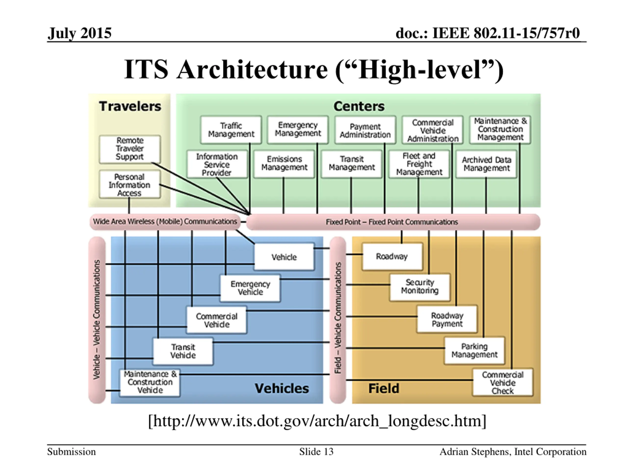 July 2015 doc.: IEEE 802.11-15/757r0 ITS Architecture ( High-level ) [http://www.its.dot.gov/arch/arch_longdesc.htm] Submission Slide 13 Adrian Stephens, Intel Corporation