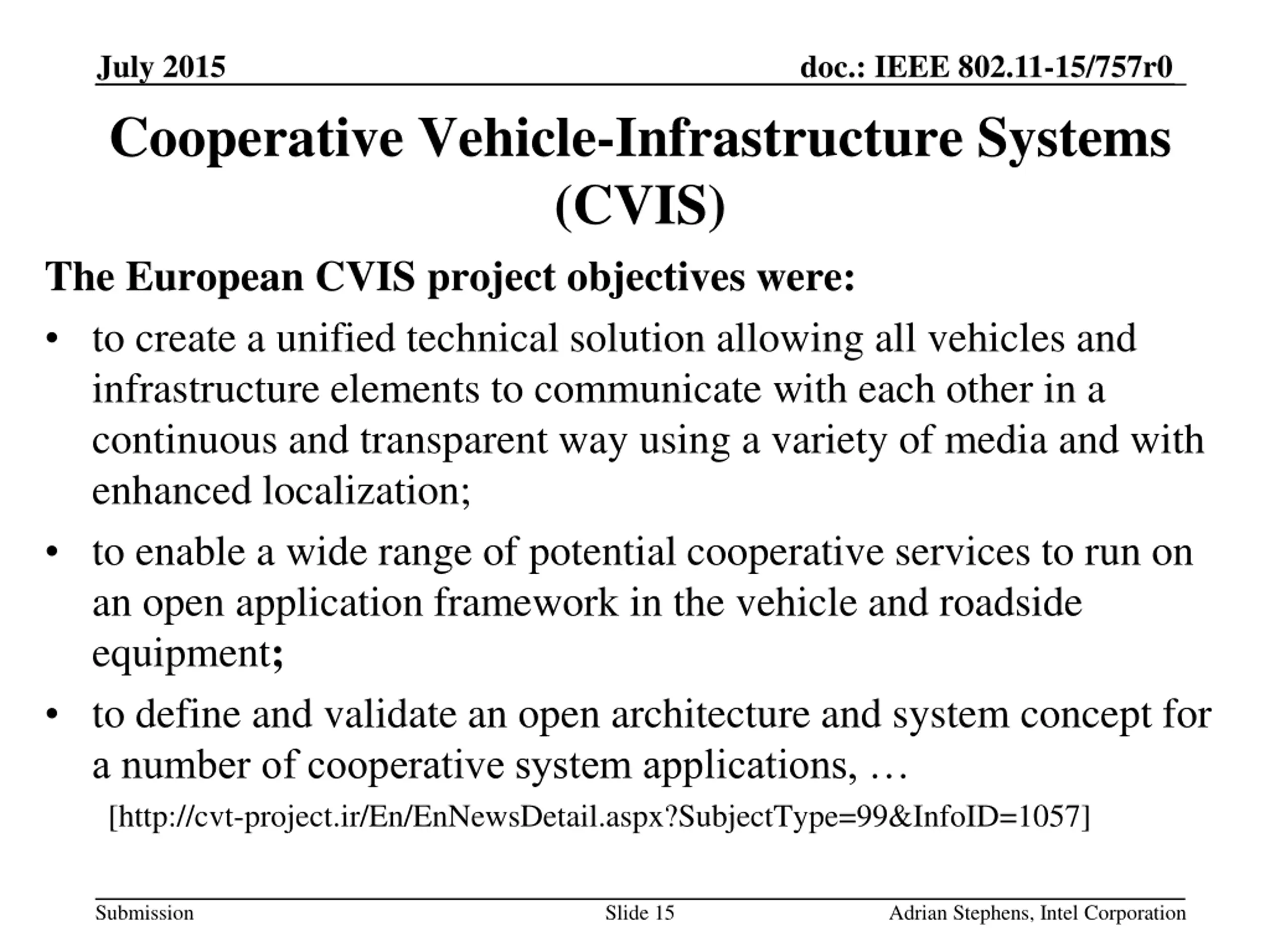 July 2015 doc.: IEEE 802.11-15/757r0 Cooperative Vehicle-Infrastructure Systems (CVIS) The European CVIS project objectives were: a multi-channel terminal capable of maintaining a continuous Internet connection over a wide range of carriers, including cellular, mobile Wi-Fi networks, infra-red or short-range microwave channels, ensuring full interoperability in the communication between different makes of vehicle and of traffic management systems; an open architecture connecting in-vehicle and traffic management systems and telematics services at the roadside, that can be easily updated and scaled up to allow implementation for various client and back-end server technologies; techniques for enhanced vehicle positioning and the creation of local dynamic maps, using satellite positioning, radio triangulation and the latest methods for location referencing; [http://cvt-project.ir/En/EnNewsDetail.aspx?SubjectType=99&InfoID=1057] Submission Slide 16 Adrian Stephens, Intel Corporation