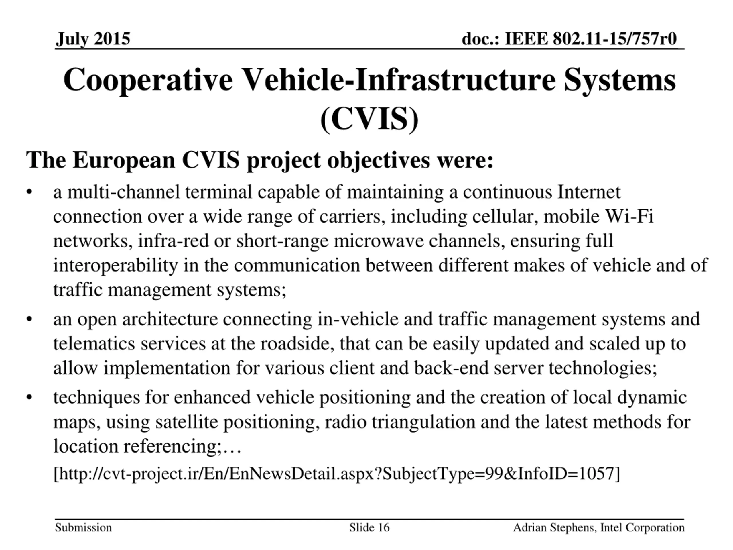 July 2015 doc.: IEEE 802.11-15/757r0 Cooperative Vehicle-Infrastructure Systems (CVIS) The European CVIS project objectives were: to create a unified technical solution allowing all vehicles and infrastructure elements to communicate with each other in a continuous and transparent way using a variety of media and with enhanced localization; to enable a wide range of potential cooperative services to run on an open application framework in the vehicle and roadside equipment; to define and validate an open architecture and system concept for a number of cooperative system applications, [http://cvt-project.ir/En/EnNewsDetail.aspx?SubjectType=99&InfoID=1057] Submission Slide 15 Adrian Stephens, Intel Corporation