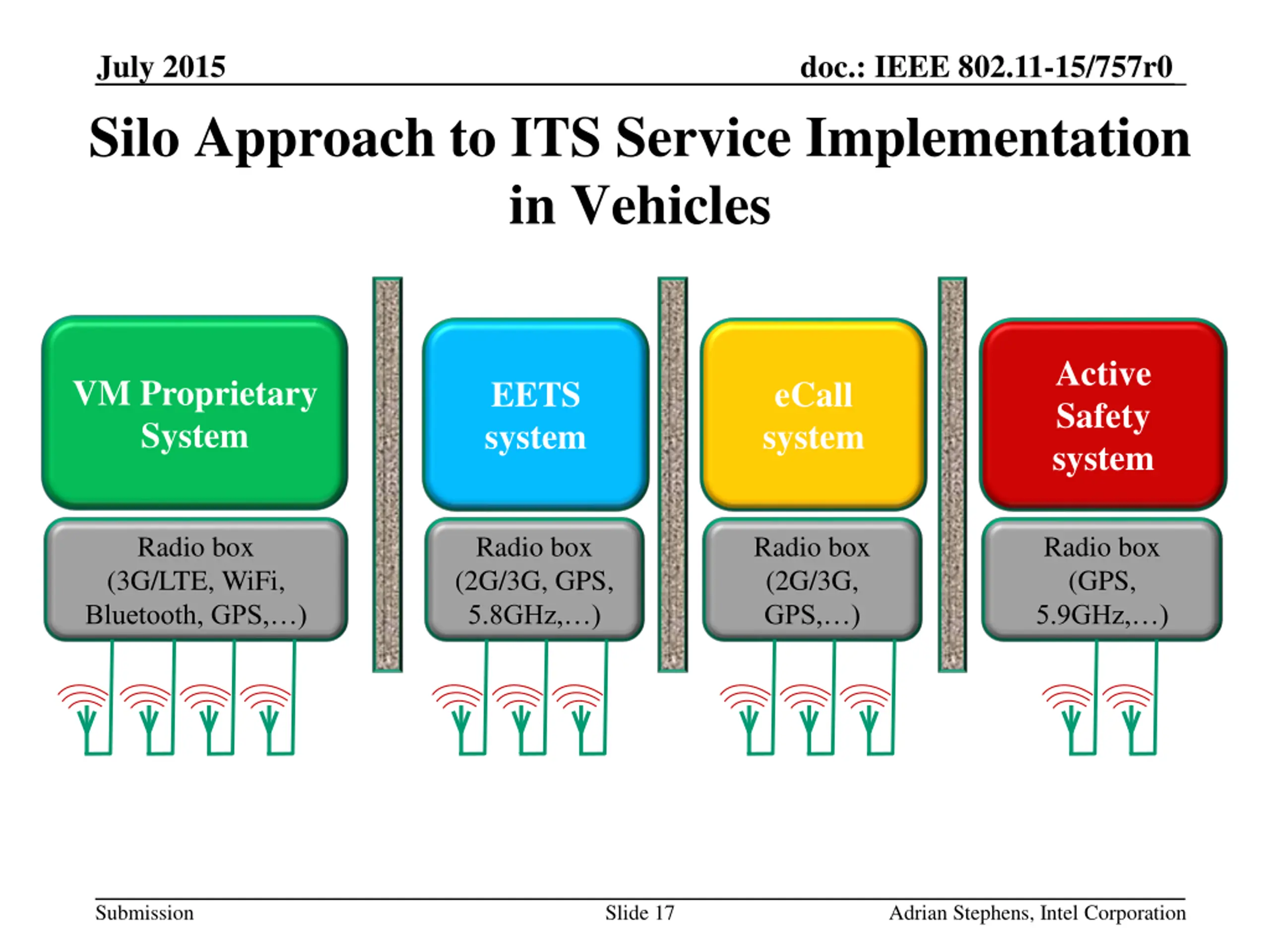 July 2015 doc.: IEEE 802.11-15/757r0 Silo Approach to ITS Service Implementation in Vehicles Active Safety system VM Proprietary System EETS system eCall system Radio box (3G/LTE, WiFi, Bluetooth, GPS, ) Radio box (2G/3G, GPS, 5.8GHz, ) Radio box (2G/3G, GPS, ) Radio box (GPS, 5.9GHz, ) Submission Slide 17 Adrian Stephens, Intel Corporation