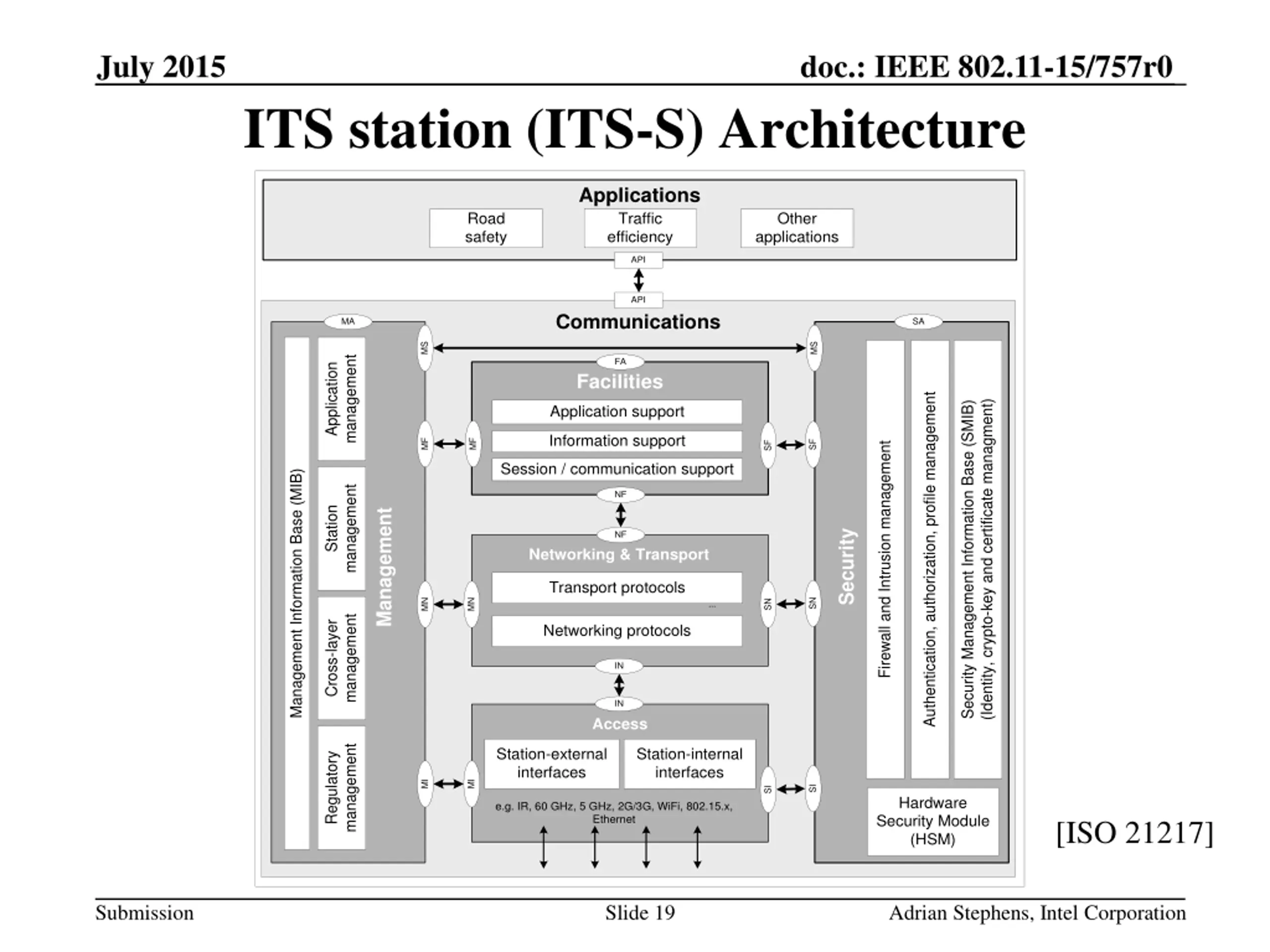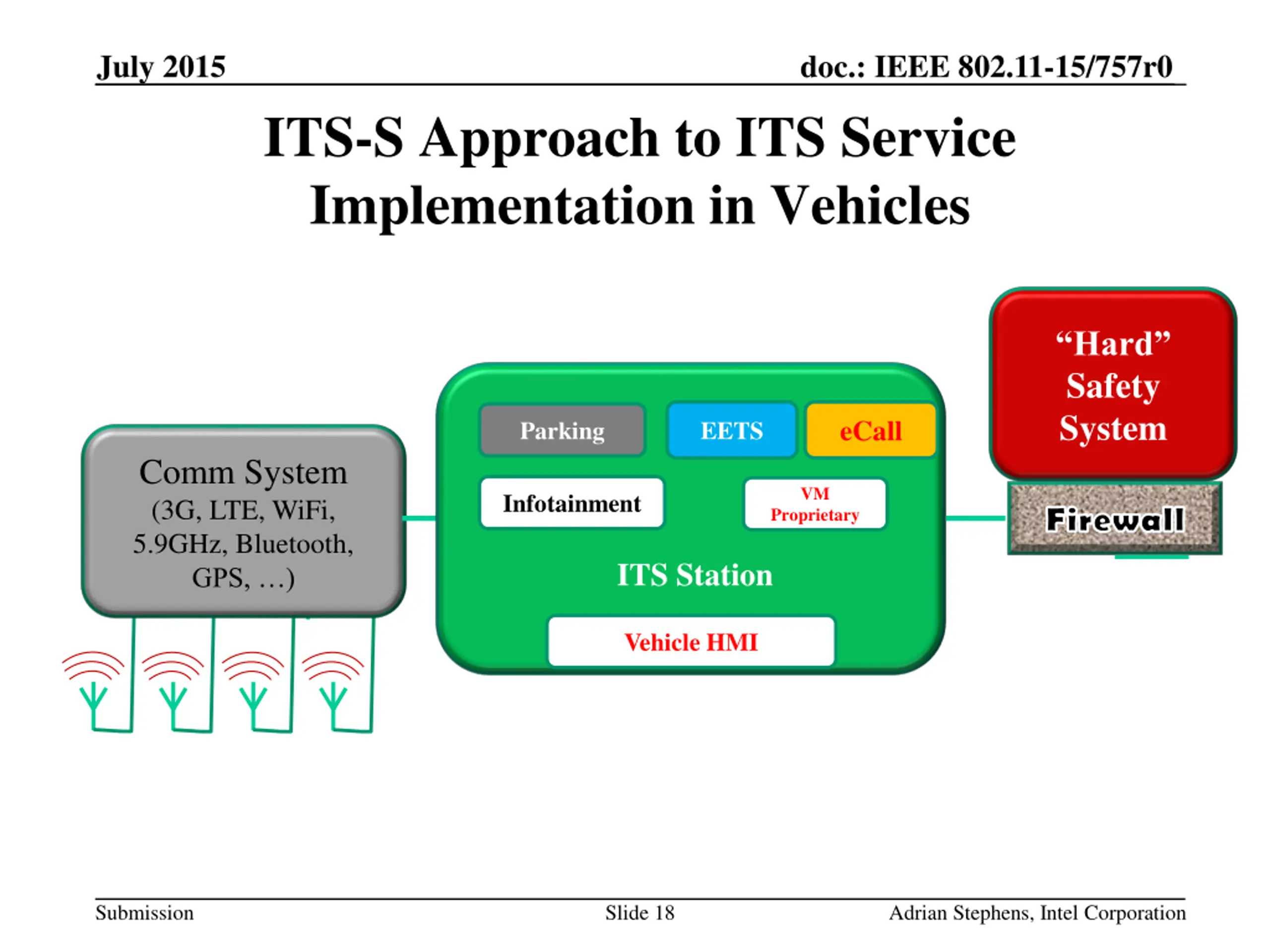 July 2015 doc.: IEEE 802.11-15/757r0 ITS-S Approach to ITS Service Implementation in Vehicles Hard Safety System eCall Parking EETS Comm System (3G, LTE, WiFi, 5.9GHz, Bluetooth, GPS, ) VM Infotainment Firewall Proprietary ITS Station Vehicle HMI Submission Slide 18 Adrian Stephens, Intel Corporation