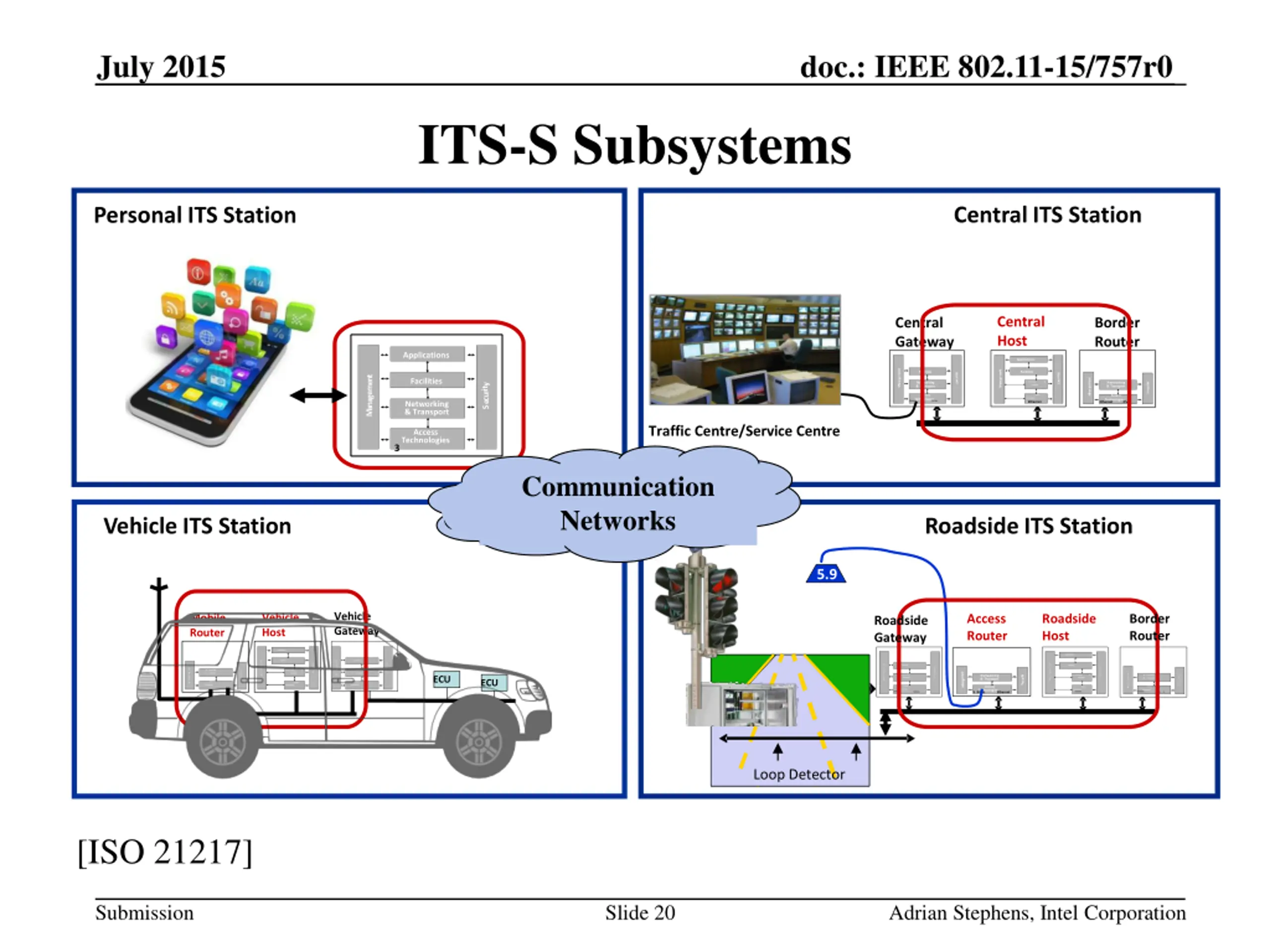 July 2015 doc.: IEEE 802.11-15/757r0 ITS-S Subsystems Central ITS Station Personal ITS Station Central Host Central Gateway Border Router Applications Applications Management Management Facilities Facilities Security Security M anagement Facilities M anagement Networking & Transport Networking & Transport N etworking & Security Security ... ... ... Transport Access Access Access Technologies Ethernet Technologies Ethernet Technologies Ethernet CAN bus Networking & Transport IPv 6 ... Traffic Centre/Service Centre Access Technologies 3 Communication Networks Vehicle ITS Station Roadside ITS Station 5.9 Vehicle Gateway Vehicle Host Mobile Router Access Router Roadside Host Border Router Roadside Gateway Applications Applications M a n a g e m e n t Ma n a g e m e n t Facilities Facilities S e c u ri t y S e c u ri t y M a n a g em ent Ma na ge m e nt Facilities Facilities S e c u r it y M a n a g e m e nt S ec urity N etworking N etworking N etworking & Se curit y M a n a ge m en t Managem ent ... ... ... Transport Transport Transport & & N etworking N etworking & Transport N etworking N etworking & Security ECU S ec urity ... ... & Transport ... Transport ... & Transport ECU Access Access Access Technologies Technologies Technologies Access Access Access Access Technologies Technologies 5.9GHz Technologies Ethernet Technologies Ethernet Ethernet Ethernet CAN bus IPv 6 SENS Ctrl Loop Detector [ISO 21217] Submission Slide 20 Adrian Stephens, Intel Corporation