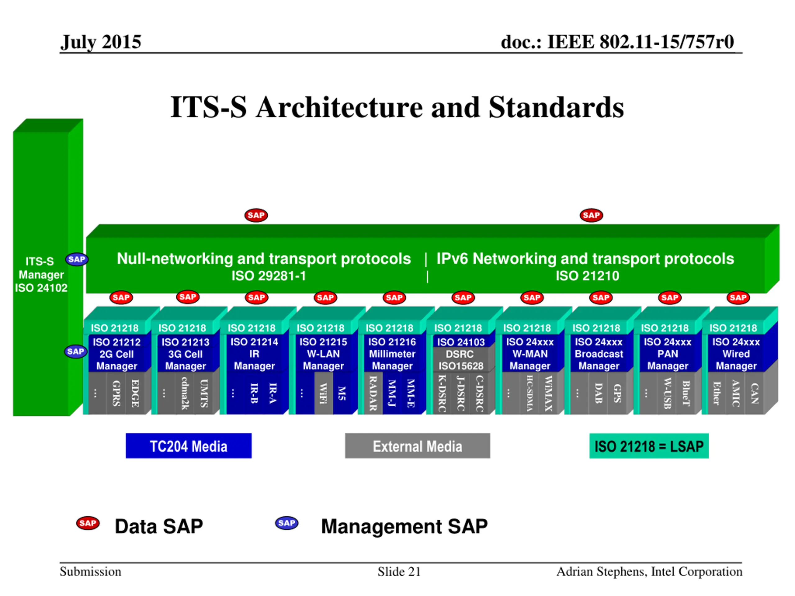 July 2015 doc.: IEEE 802.11-15/757r0 ITS-S Architecture and Standards SAP SAP Null-networking and transport protocols | IPv6 Networking and transport protocols ISO 29281-1 | ISO 21210 SAP ITS-S Manager ISO 24102 SAP SAP SAP SAP SAP SAP SAP SAP SAP SAP ISO 21218 ISO 21218 ISO 21218 ISO 21218 ISO 21218 ISO 21218 ISO 21218 ISO 21218 ISO 21218 ISO 21218 ISO 21214 IR Manager ISO 21215 W-LAN Manager ISO 21216 Millimeter Manager ISO 24xxx W-MAN Manager ISO 24xxx Broadcast Manager ISO 24xxx PAN Manager ISO 24xxx Wired Manager ISO 21212 ISO 21213 ISO 24103 SAP 2G Cell Manager 3G Cell Manager DSRC ISO15628 K-DSRC C-DSRC HC-SDMA WiMAX RADAR J-DSRC cdma2k W-USB MM-E UMTS EDGE AMIC MM-J GPRS BlueT Ether IR-A WiFi CAN IR-B DAB GPS M5 TC204 Media External Media ISO 21218 = LSAP Data SAP Management SAP SAP SAP Submission Adrian Stephens, Intel Corporation Slide 21