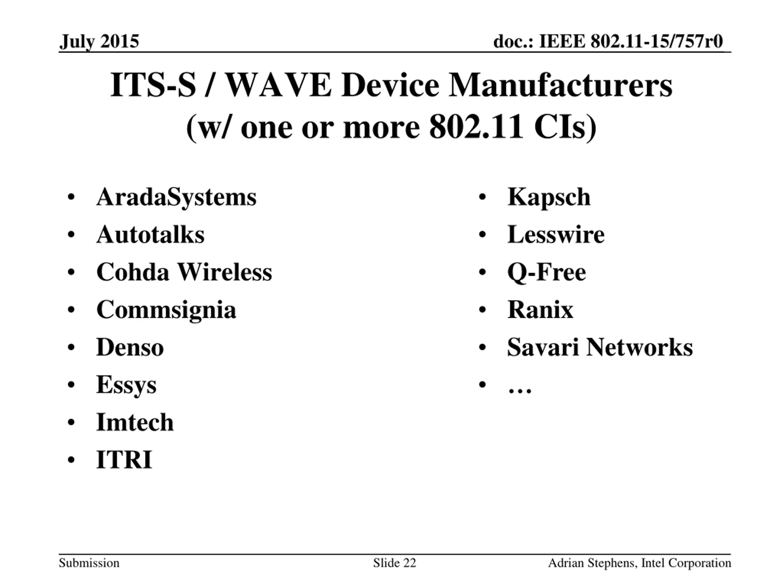 July 2015 doc.: IEEE 802.11-15/757r0 ITS-S / WAVE Device Manufacturers (w/ one or more 802.11 CIs) AradaSystems Autotalks Cohda Wireless Commsignia Denso Essys Imtech ITRI Kapsch Lesswire Q-Free Ranix Savari Networks Submission Slide 22 Adrian Stephens, Intel Corporation