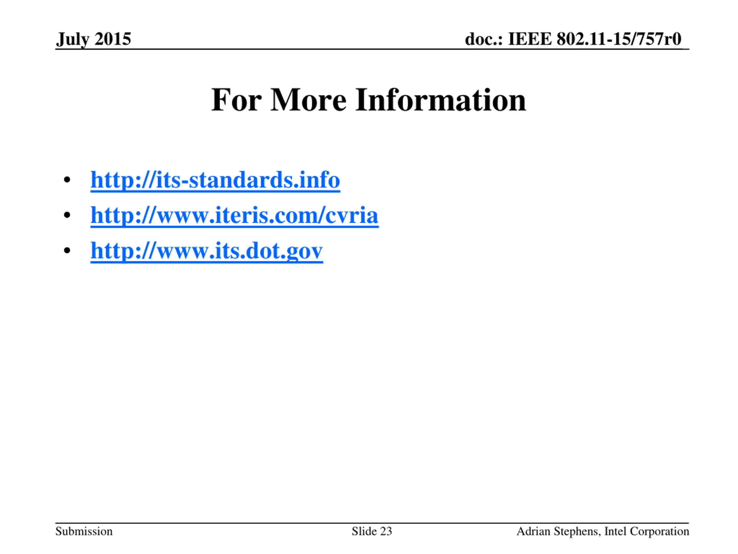 July 2015 doc.: IEEE 802.11-15/757r0 For More Information http://its-standards.info http://www.iteris.com/cvria http://www.its.dot.gov Submission Slide 23 Adrian Stephens, Intel Corporation