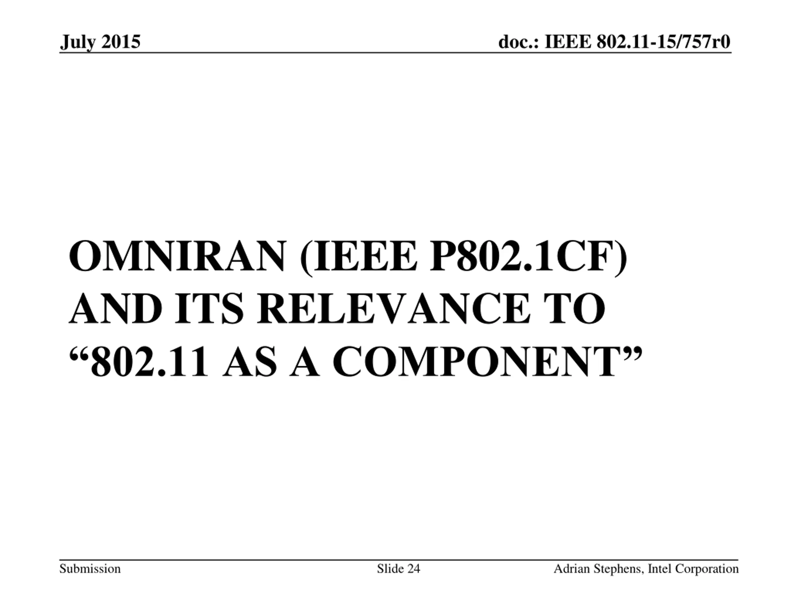 July 2015 doc.: IEEE 802.11-15/757r0 OMNIRAN (IEEE P802.1CF) AND ITS RELEVANCE TO 802.11 AS A COMPONENT Submission Slide 24 Adrian Stephens, Intel Corporation
