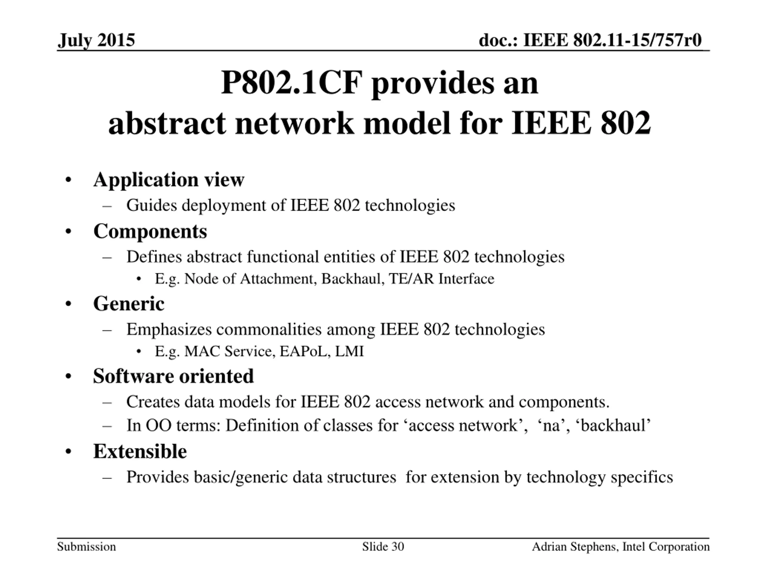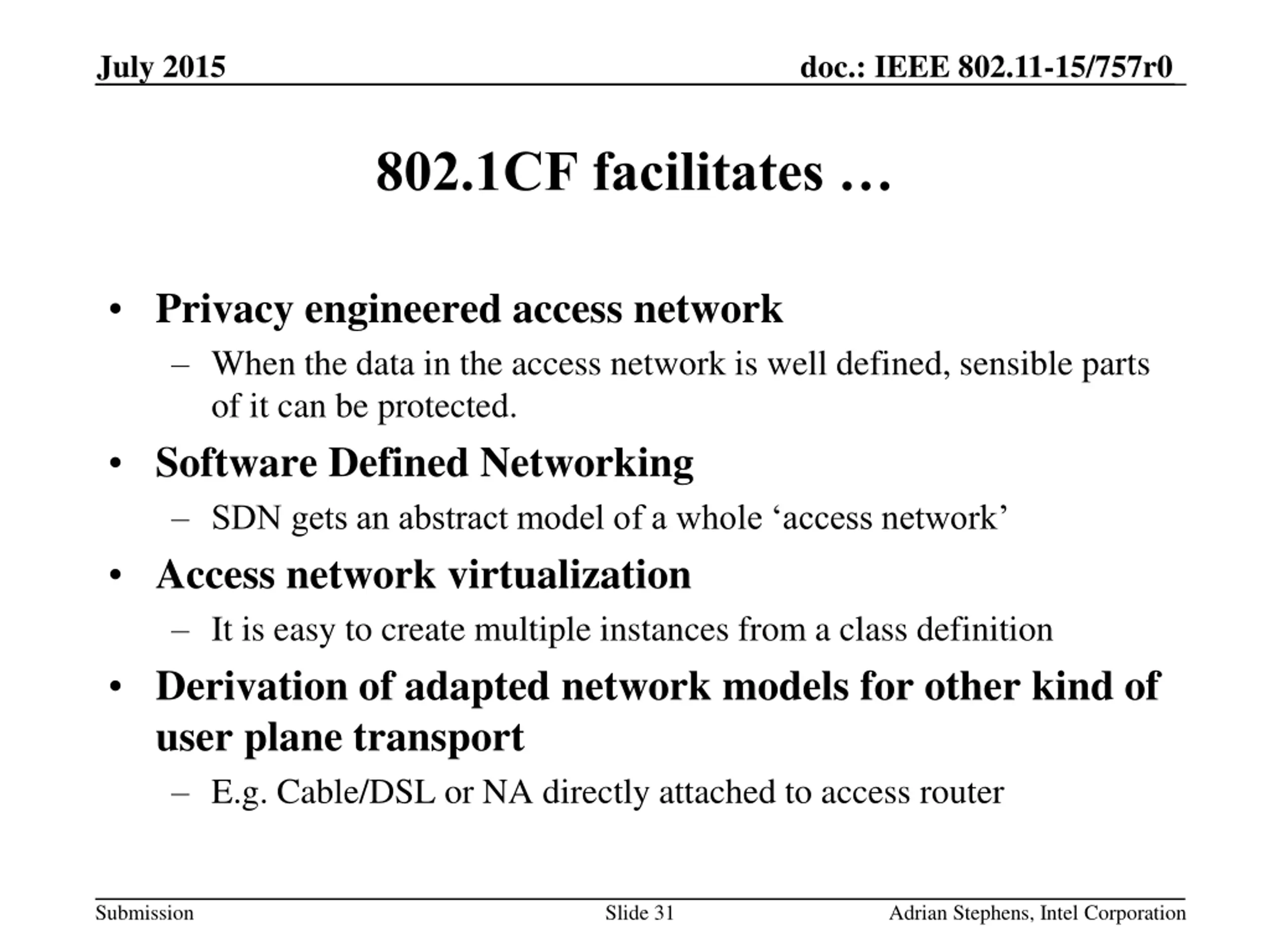 July 2015 doc.: IEEE 802.11-15/757r0 P802.1CF provides an abstract network model for IEEE 802 Application view Guides deployment of IEEE 802 technologies Components Defines abstract functional entities of IEEE 802 technologies E.g. Node of Attachment, Backhaul, TE/AR Interface Generic Emphasizes commonalities among IEEE 802 technologies E.g. MAC Service, EAPoL, LMI Software oriented Creates data models for IEEE 802 access network and components. In OO terms: Definition of classes for access network , na , backhaul Extensible Provides basic/generic data structures for extension by technology specifics Submission Slide 30 Adrian Stephens, Intel Corporation