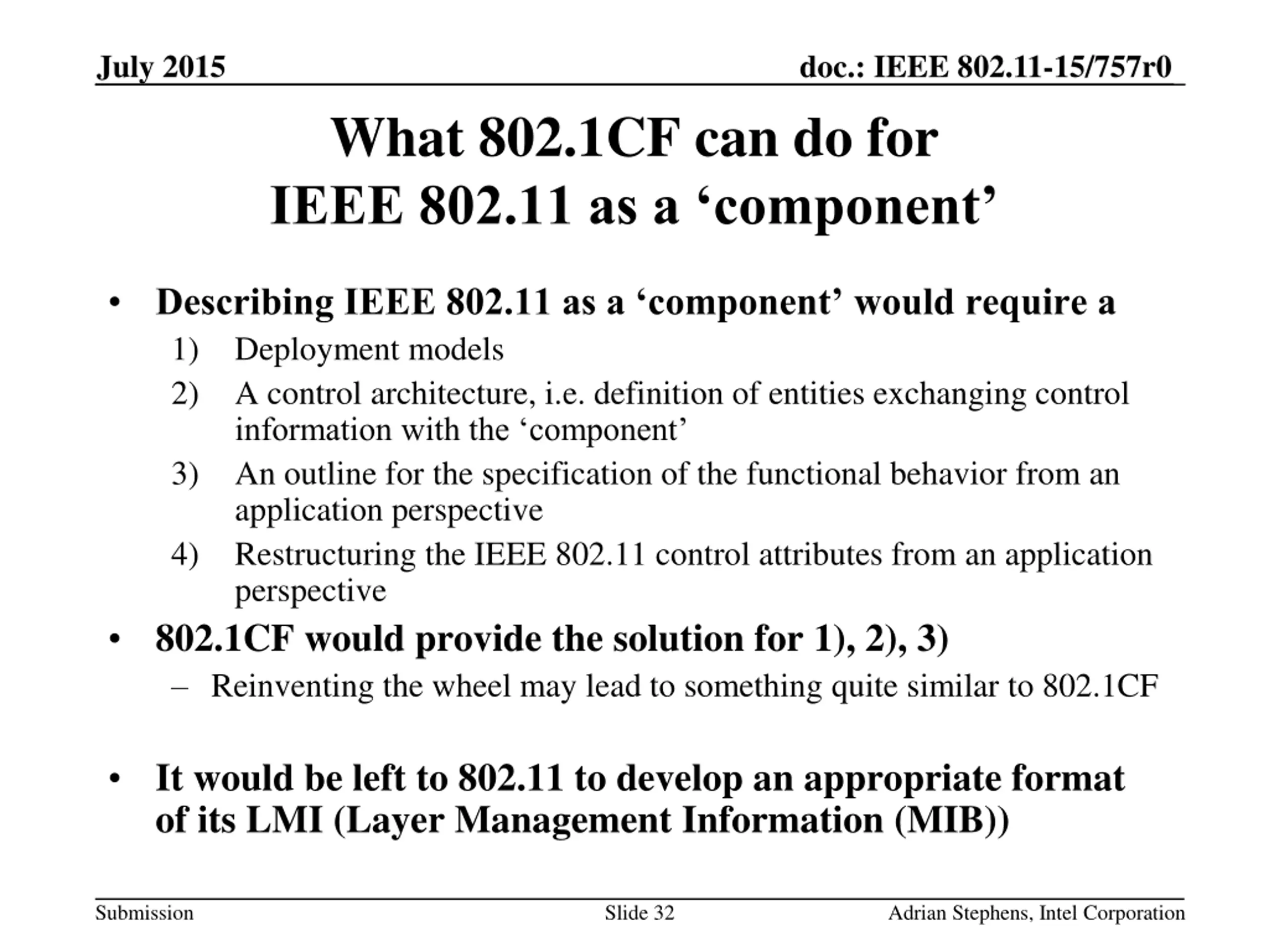 July 2015 doc.: IEEE 802.11-15/757r0 What 802.1CF can do for IEEE 802.11 as a component Describing IEEE 802.11 as a component would require a 1) Deployment models 2) A control architecture, i.e. definition of entities exchanging control information with the component 3) An outline for the specification of the functional behavior from an application perspective 4) Restructuring the IEEE 802.11 control attributes from an application perspective 802.1CF would provide the solution for 1), 2), 3) Reinventing the wheel may lead to something quite similar to 802.1CF It would be left to 802.11 to develop an appropriate format of its LMI (Layer Management Information (MIB)) Submission Slide 32 Adrian Stephens, Intel Corporation