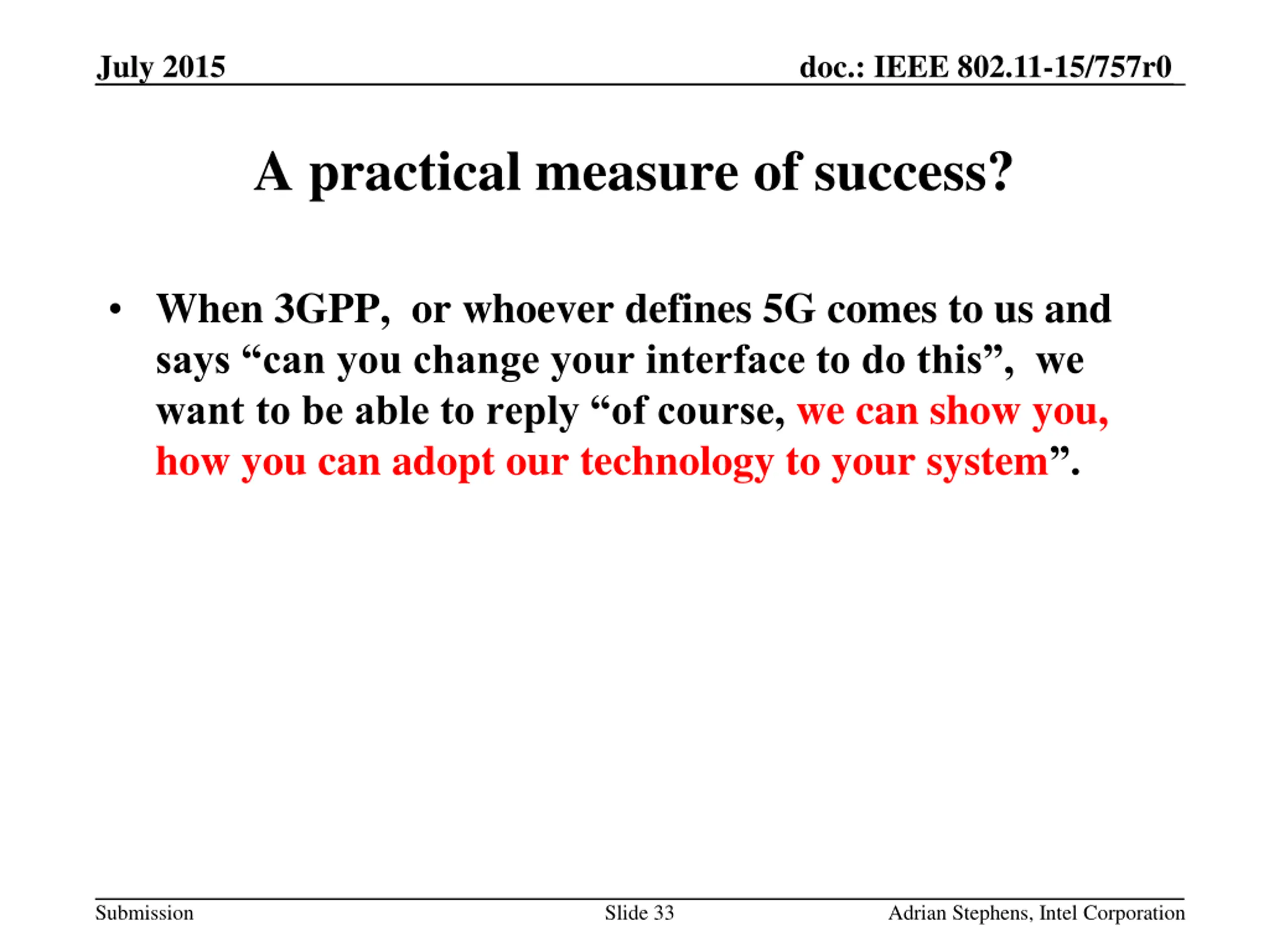 July 2015 doc.: IEEE 802.11-15/757r0 A practical measure of success? When 3GPP, or whoever defines 5G comes to us and says can you change your interface to do this , we want to be able to reply of course, we can show you, how you can adopt our technology to your system . Submission Slide 33 Adrian Stephens, Intel Corporation