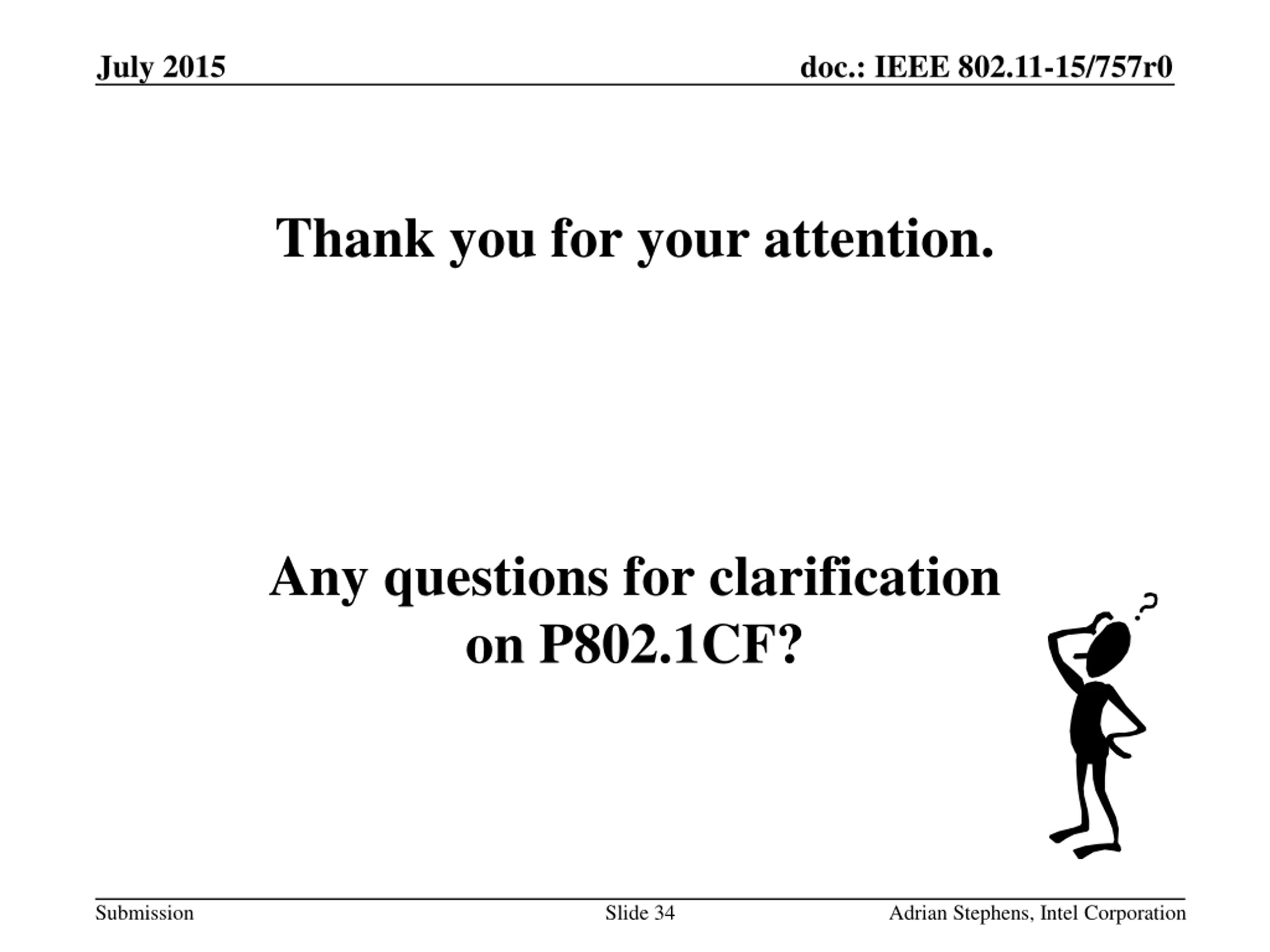July 2015 doc.: IEEE 802.11-15/757r0 Thank you for your attention. Any questions for clarification on P802.1CF? Submission Slide 34 Adrian Stephens, Intel Corporation