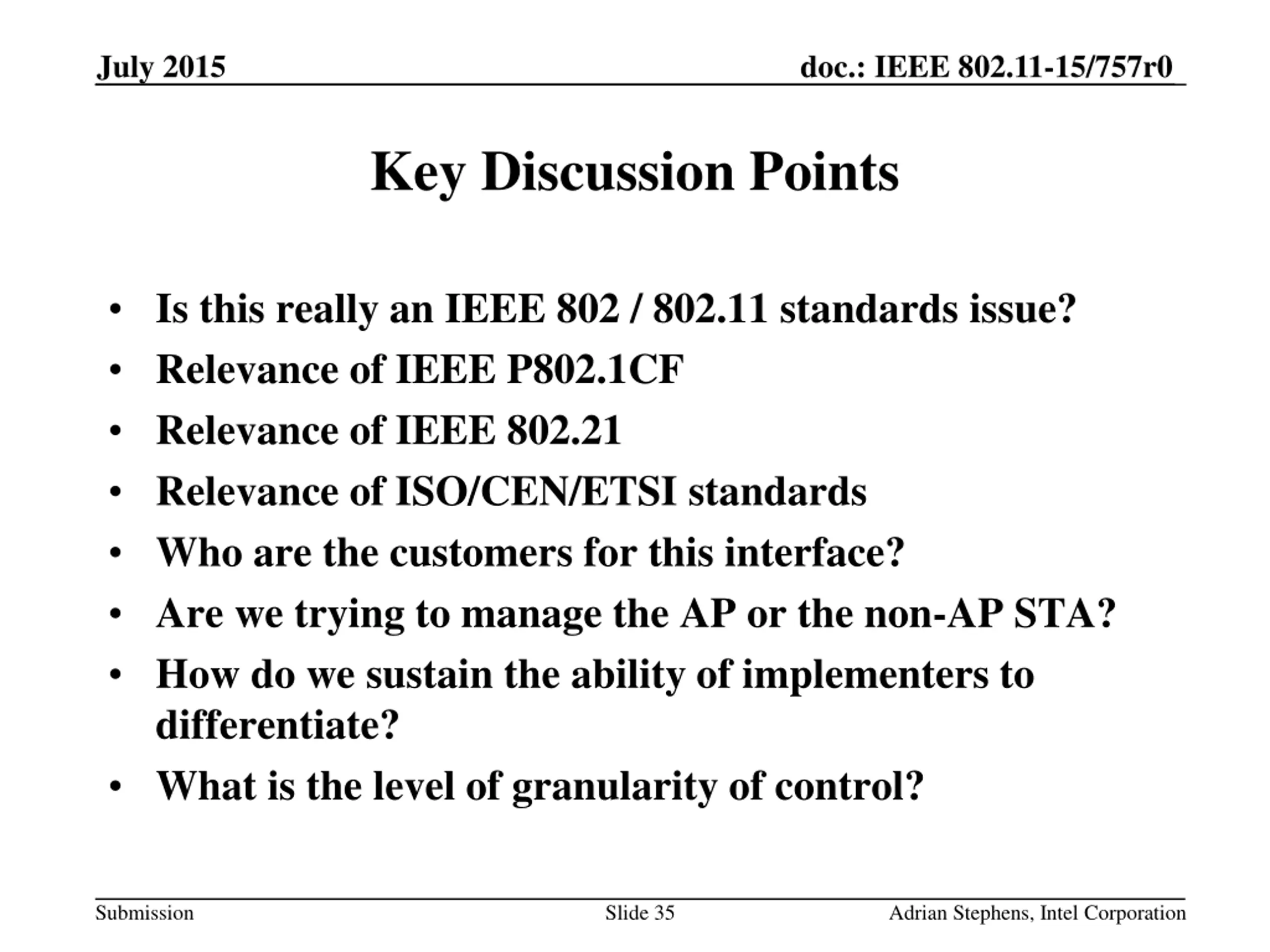 July 2015 doc.: IEEE 802.11-15/757r0 Key Discussion Points Is this really an IEEE 802 / 802.11 standards issue? Relevance of IEEE P802.1CF Relevance of IEEE 802.21 Relevance of ISO/CEN/ETSI standards Who are the customers for this interface? Are we trying to manage the AP or the non-AP STA? How do we sustain the ability of implementers to differentiate? What is the level of granularity of control? Submission Slide 35 Adrian Stephens, Intel Corporation