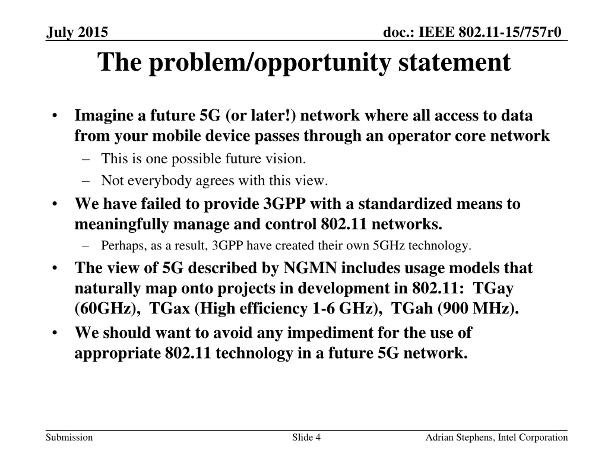 July 2015 doc.: IEEE 802.11-15/757r0 The problem/opportunity statement Imagine a future 5G (or later!) network where all access to data from your mobile device passes through an operator core network This is one possible future vision. Not everybody agrees with this view. We have failed to provide 3GPP with a standardized means to meaningfully manage and control 802.11 networks. Perhaps, as a result, 3GPP have created their own 5GHz technology. The view of 5G described by NGMN includes usage models that naturally map onto projects in development in 802.11: TGay (60GHz), TGax (High efficiency 1-6 GHz), TGah (900 MHz). We should want to avoid any impediment for the use of appropriate 802.11 technology in a future 5G network. Submission Slide 4 Adrian Stephens, Intel Corporation