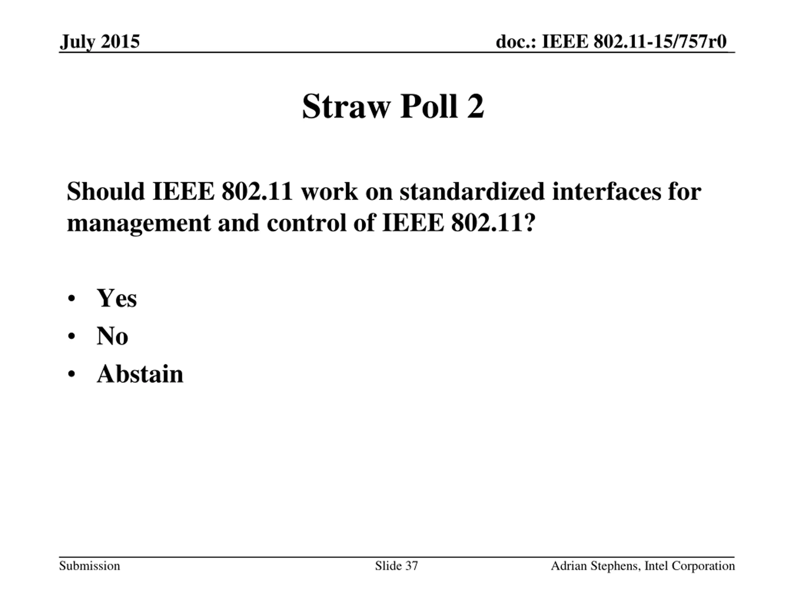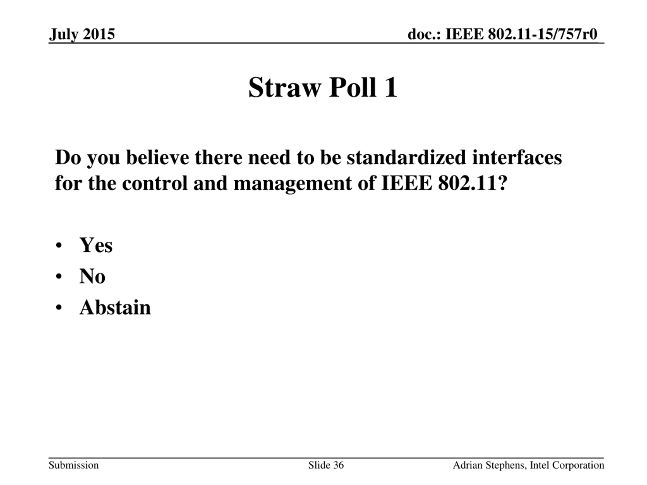 July 2015 doc.: IEEE 802.11-15/757r0 Straw Poll 1 Do you believe there need to be standardized interfaces for the control and management of IEEE 802.11? Yes No Abstain Submission Slide 36 Adrian Stephens, Intel Corporation