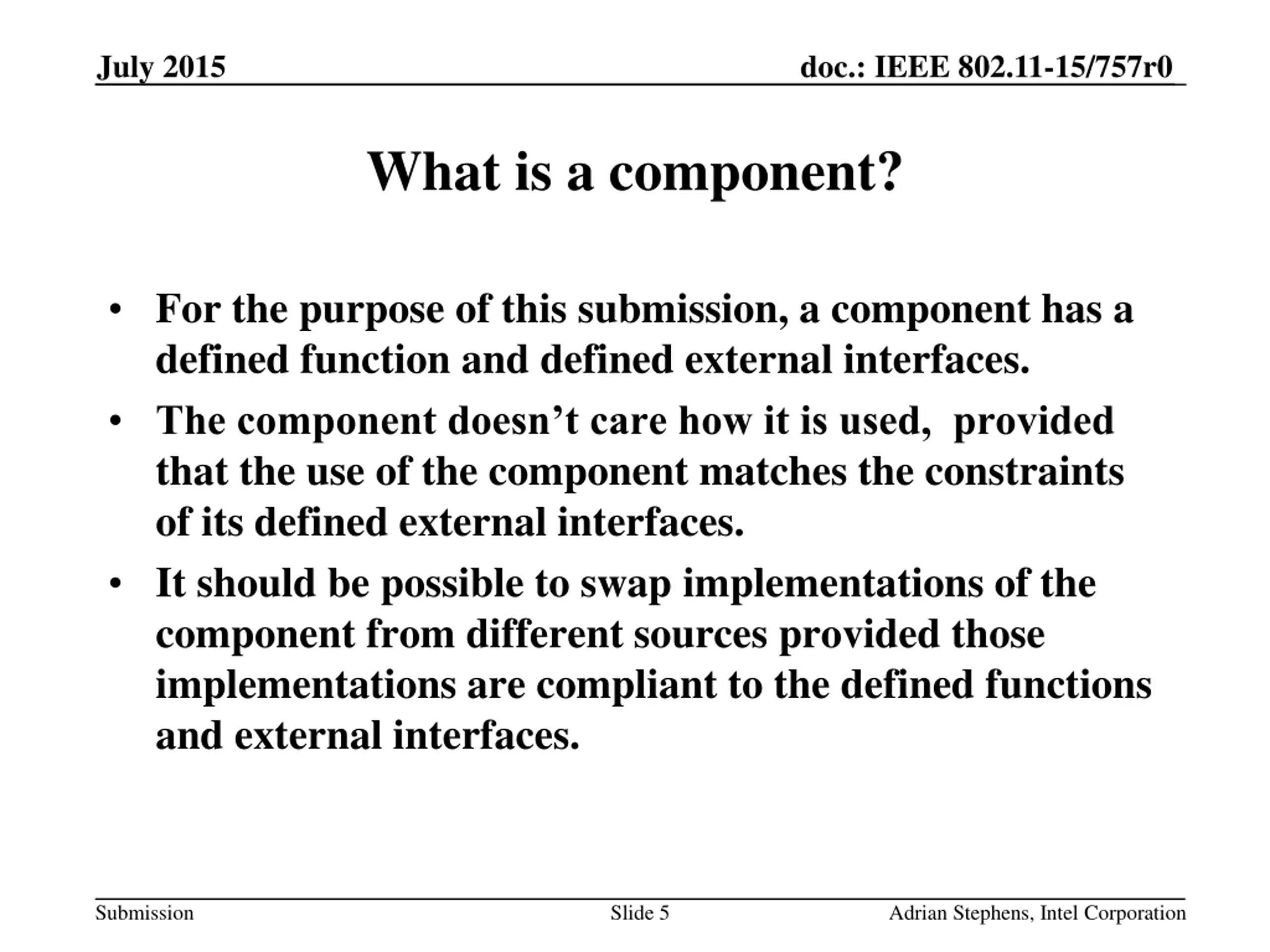 July 2015 doc.: IEEE 802.11-15/757r0 What is a component? For the purpose of this submission, a component has a defined function and defined external interfaces. The component doesn t care how it is used, provided that the use of the component matches the constraints of its defined external interfaces. It should be possible to swap implementations of the component from different sources provided those implementations are compliant to the defined functions and external interfaces. Submission Slide 5 Adrian Stephens, Intel Corporation