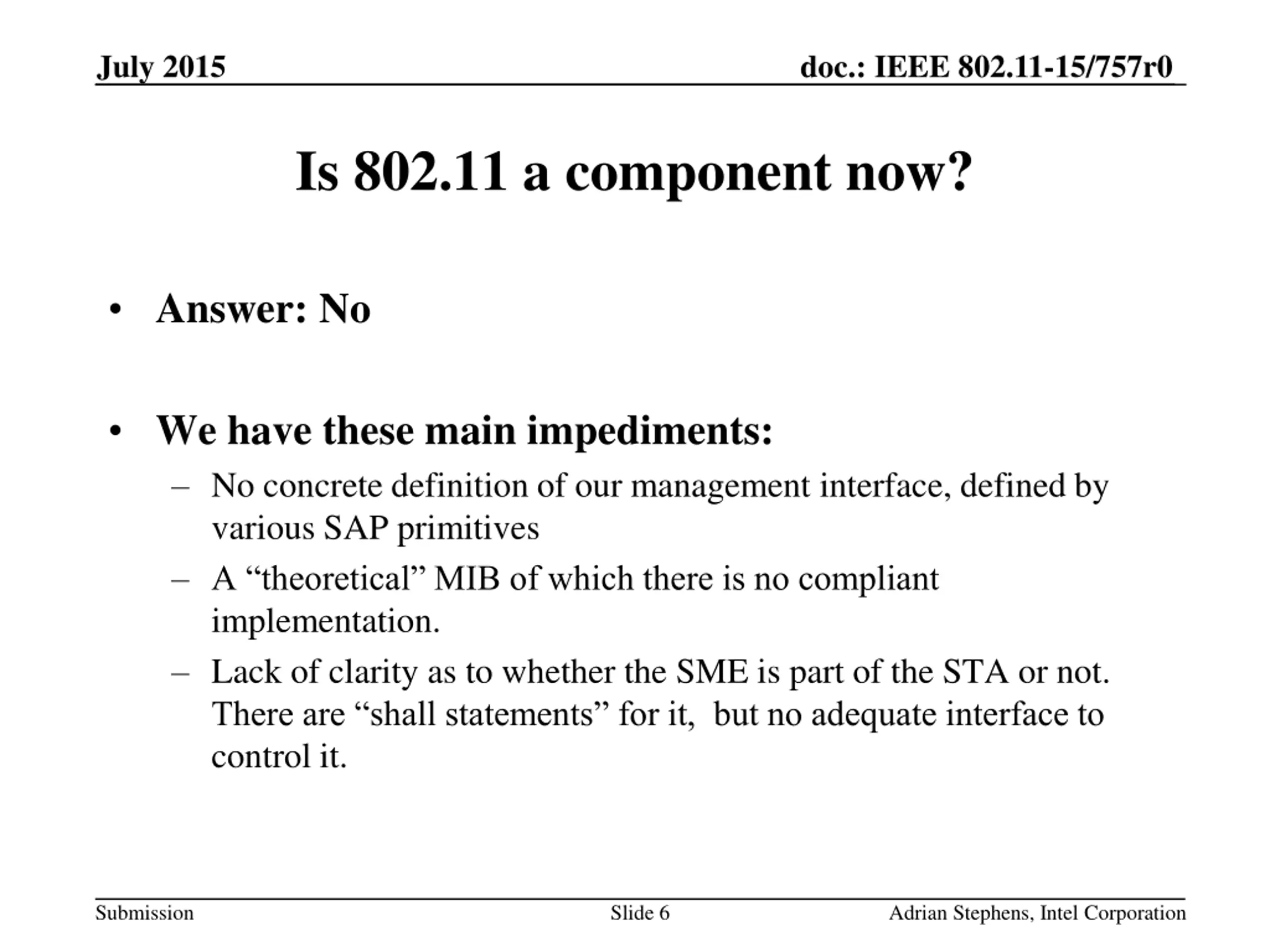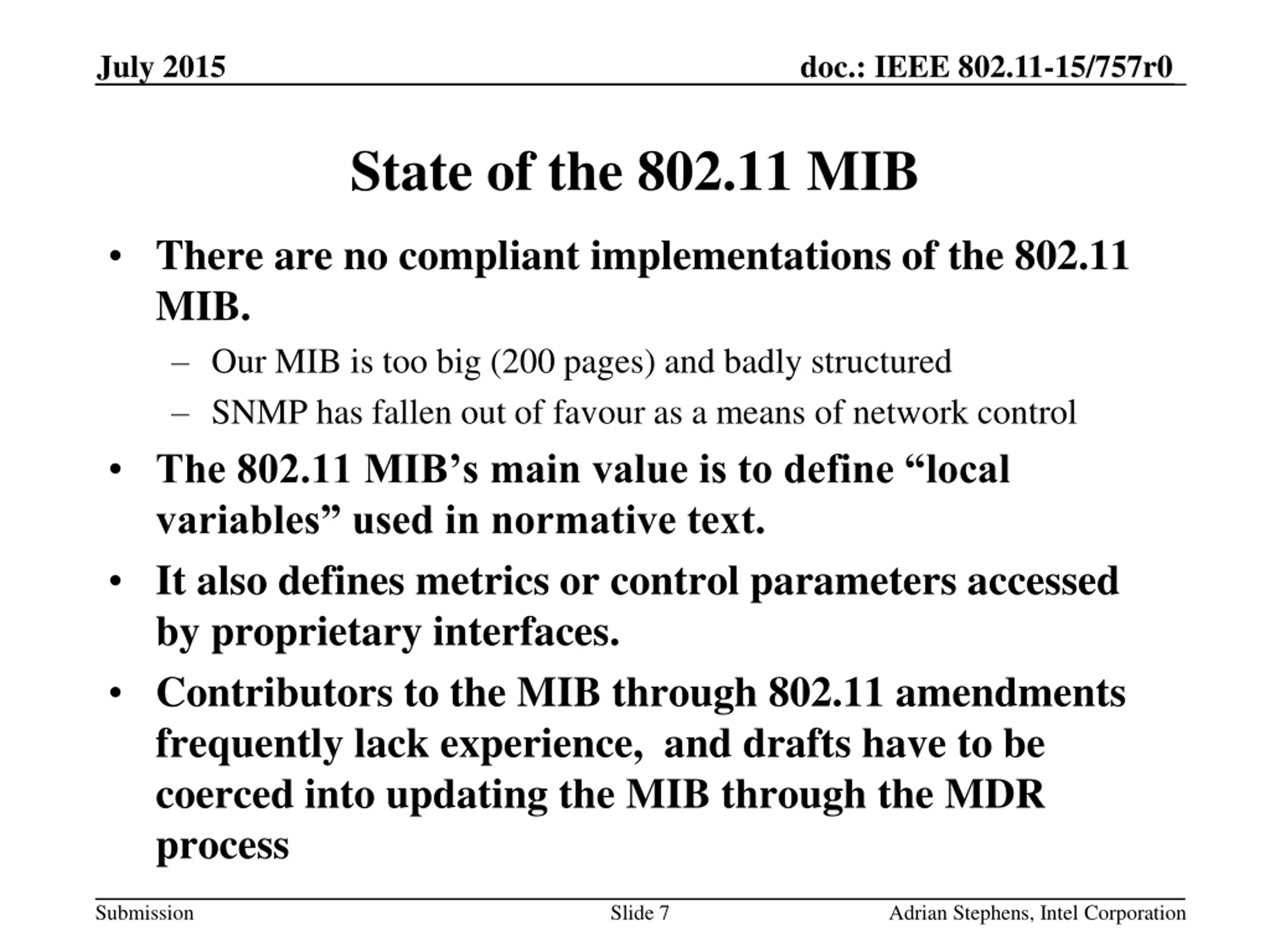 July 2015 doc.: IEEE 802.11-15/757r0 Is 802.11 a component now? Answer: No We have these main impediments: No concrete definition of our management interface, defined by various SAP primitives A theoretical MIB of which there is no compliant implementation. Lack of clarity as to whether the SME is part of the STA or not. There are shall statements for it, but no adequate interface to control it. Submission Slide 6 Adrian Stephens, Intel Corporation