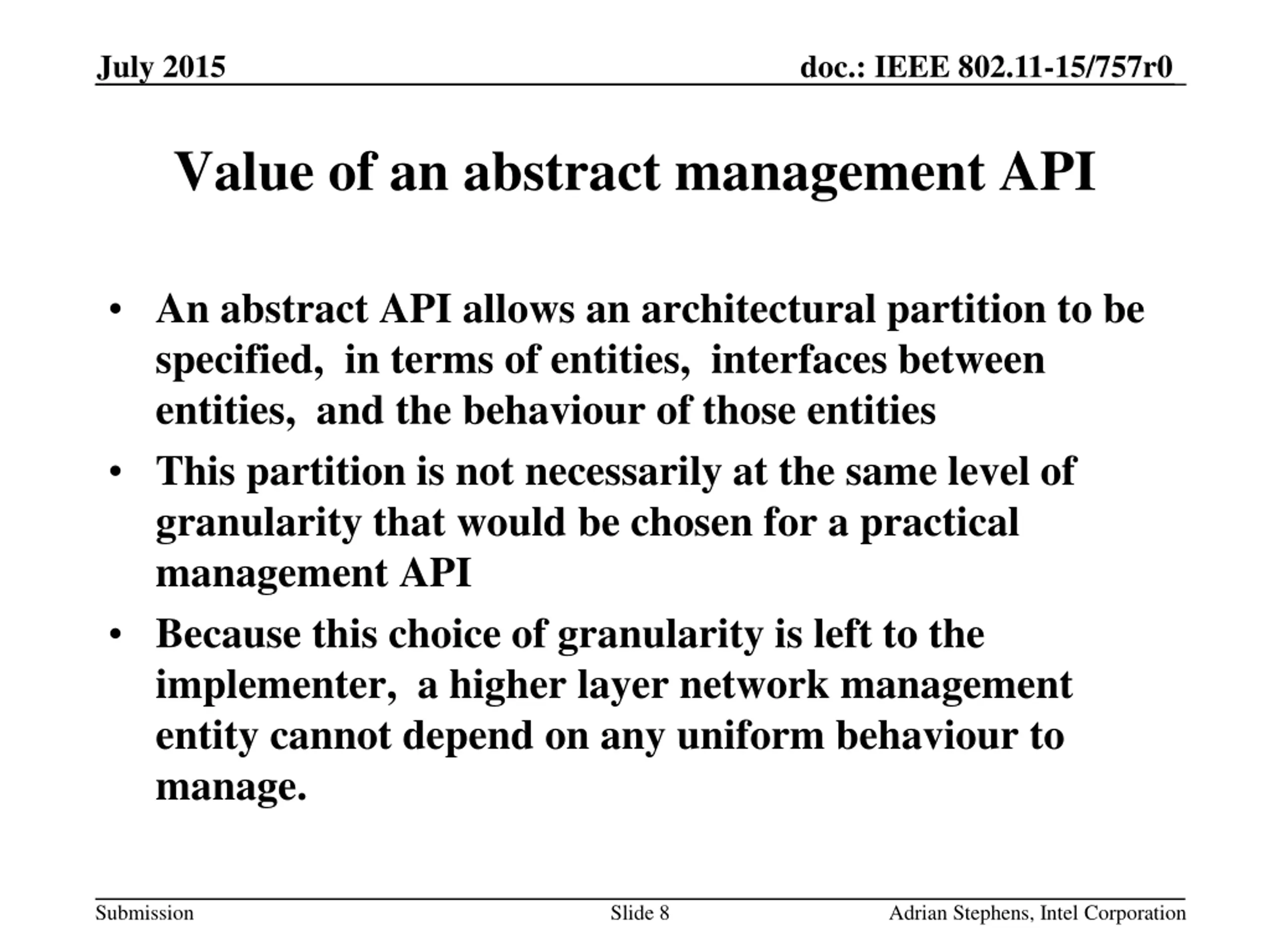 July 2015 doc.: IEEE 802.11-15/757r0 Value of an abstract management API An abstract API allows an architectural partition to be specified, in terms of entities, interfaces between entities, and the behaviour of those entities This partition is not necessarily at the same level of granularity that would be chosen for a practical management API Because this choice of granularity is left to the implementer, a higher layer network management entity cannot depend on any uniform behaviour to manage. Submission Slide 8 Adrian Stephens, Intel Corporation