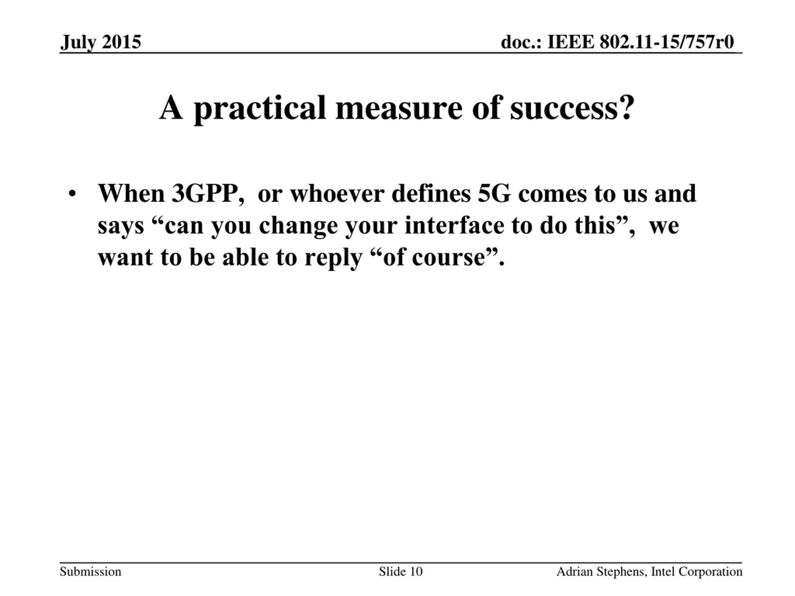 July 2015 doc.: IEEE 802.11-15/757r0 A practical measure of success? When 3GPP, or whoever defines 5G comes to us and says can you change your interface to do this , we want to be able to reply of course . Submission Slide 10 Adrian Stephens, Intel Corporation