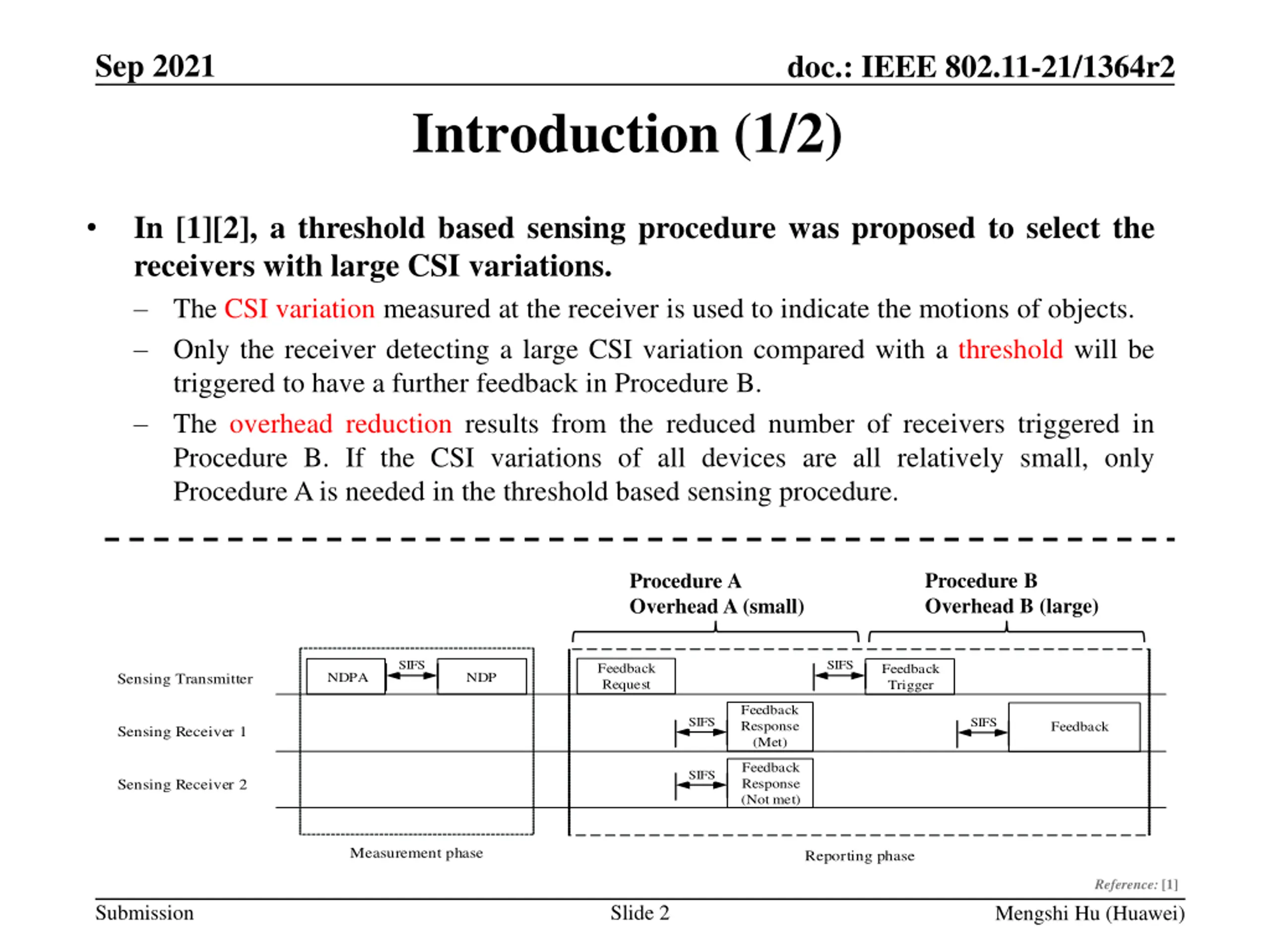 Sep 2021 doc.: IEEE 802.11-21/1364r2 Introduction (1/2) In [1][2], a threshold based sensing procedure was proposed to select the receivers with large CSI variations. The CSI variation measured at the receiver is used to indicate the motions of objects. Only the receiver detecting a large CSI variation compared with a threshold will be triggered to have a further feedback in Procedure B. The overhead reduction results from the reduced number of receivers triggered in Procedure B. If the CSI variations of all devices are all relatively small, only Procedure A is needed in the threshold based sensing procedure. Procedure B Overhead B (large) Procedure A Overhead A (small) SIFS SIFS Feedback Request Feedback Trigger NDPA NDP Sensing Transmitter Feedback Response (Met) SIFS SIFS Feedback Sensing Receiver 1 Feedback Response (Not met) SIFS Sensing Receiver 2 Measurement phase Reporting phase Reference: [1] Submission Slide 2 Mengshi Hu (Huawei)