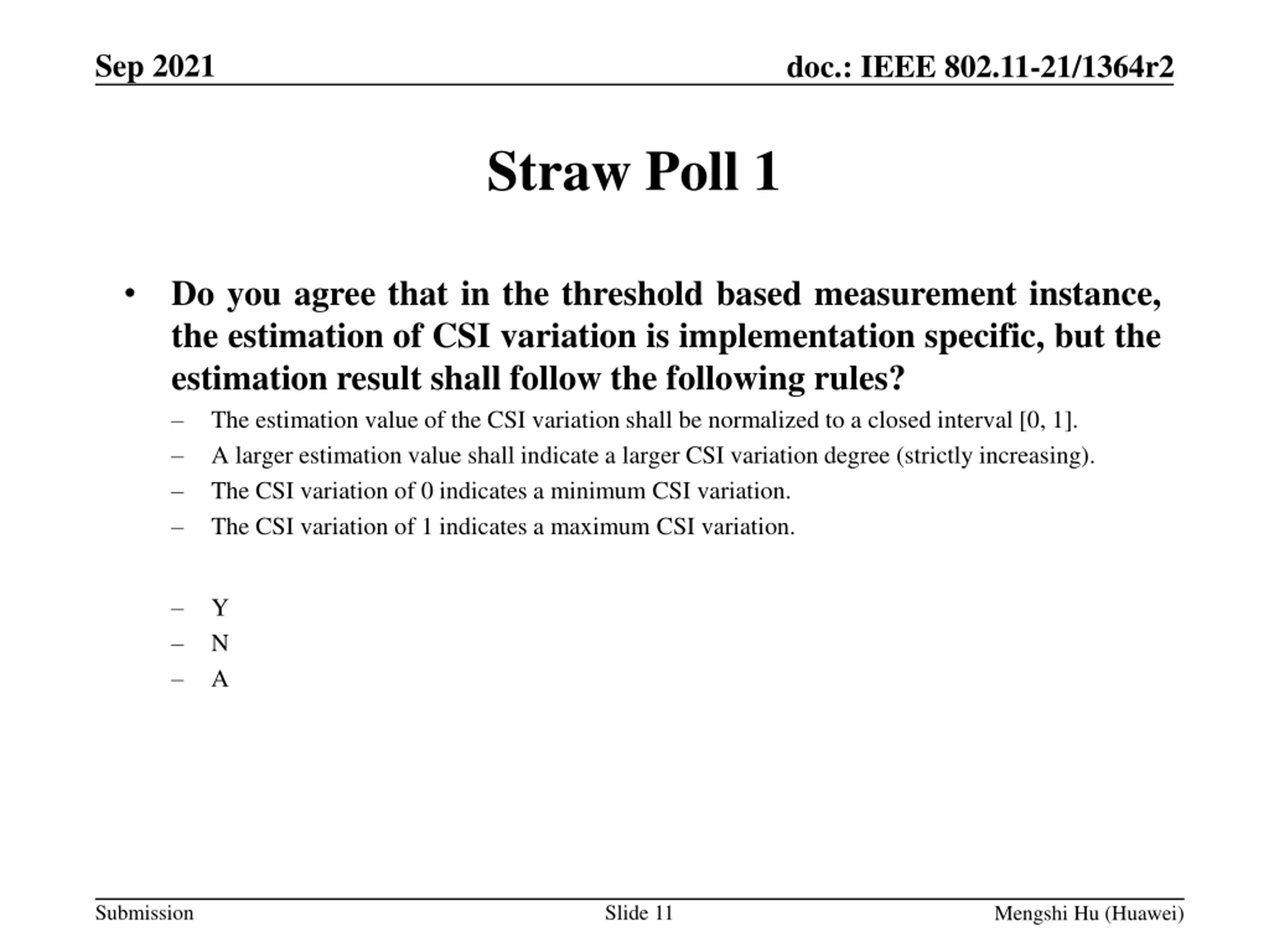 Sep 2021 doc.: IEEE 802.11-21/1364r2 Straw Poll 1 Do you agree that in the threshold based measurement instance, the estimation of CSI variation is implementation specific, but the estimation result shall follow the following rules? The estimation value of the CSI variation shall be normalized to a closed interval [0, 1]. A larger estimation value shall indicate a larger CSI variation degree (strictly increasing). The CSI variation of 0 indicates a minimum CSI variation. The CSI variation of 1 indicates a maximum CSI variation. Y N A Submission Slide 11 Mengshi Hu (Huawei)