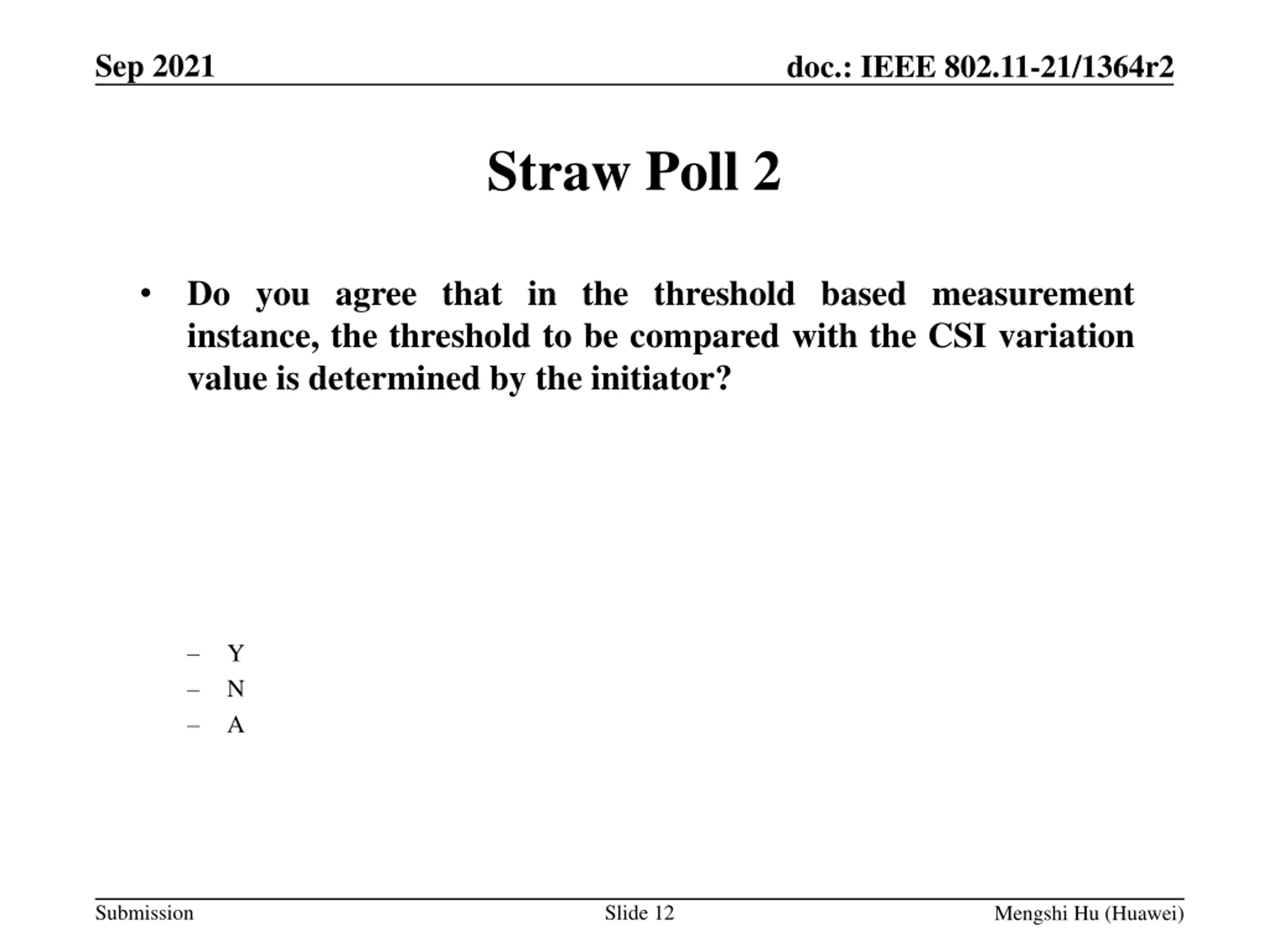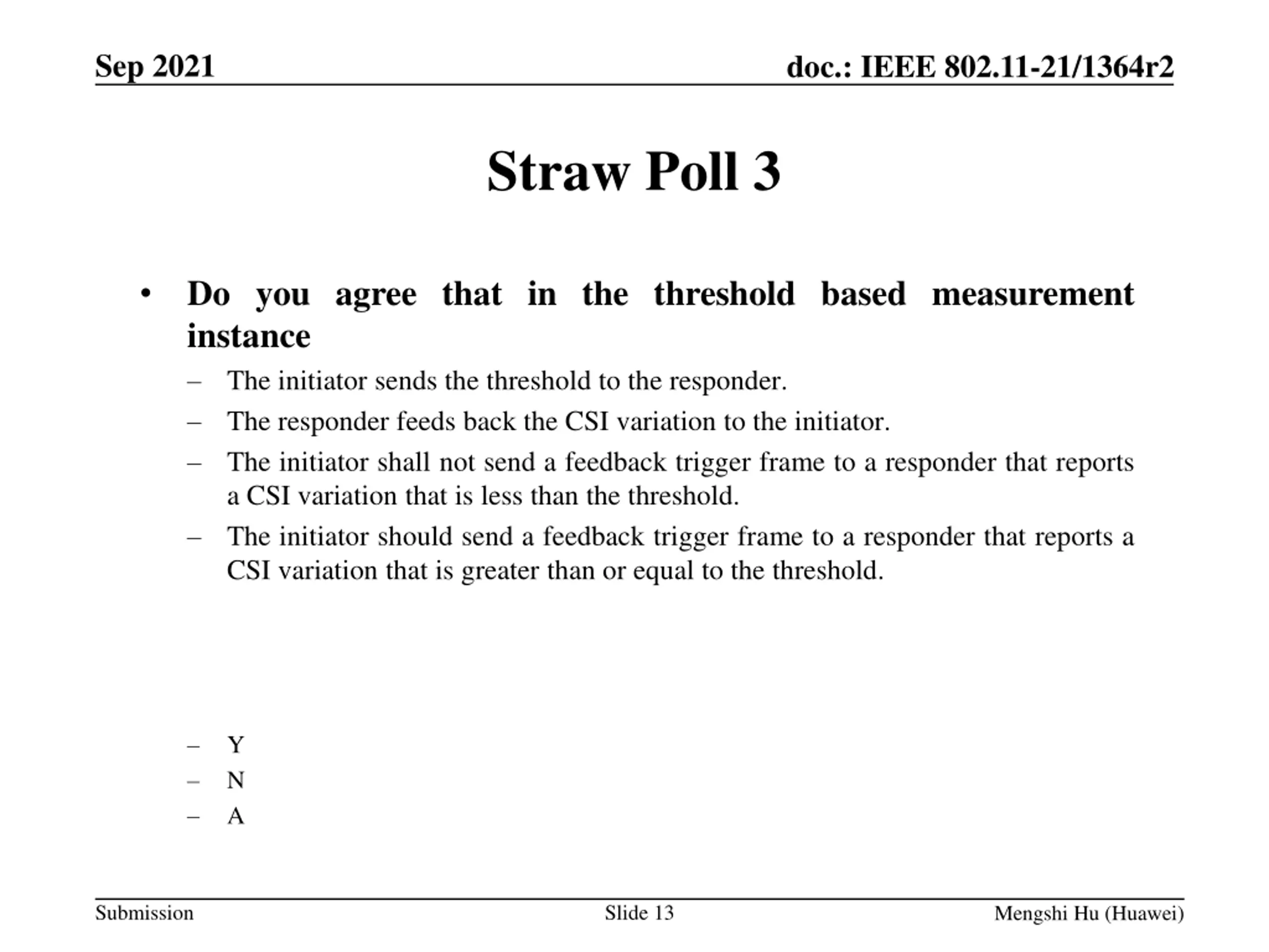Sep 2021 doc.: IEEE 802.11-21/1364r2 Straw Poll 2 Do you agree that in the threshold based measurement instance, the threshold to be compared with the CSI variation value is determined by the initiator? Y N A Submission Slide 12 Mengshi Hu (Huawei)