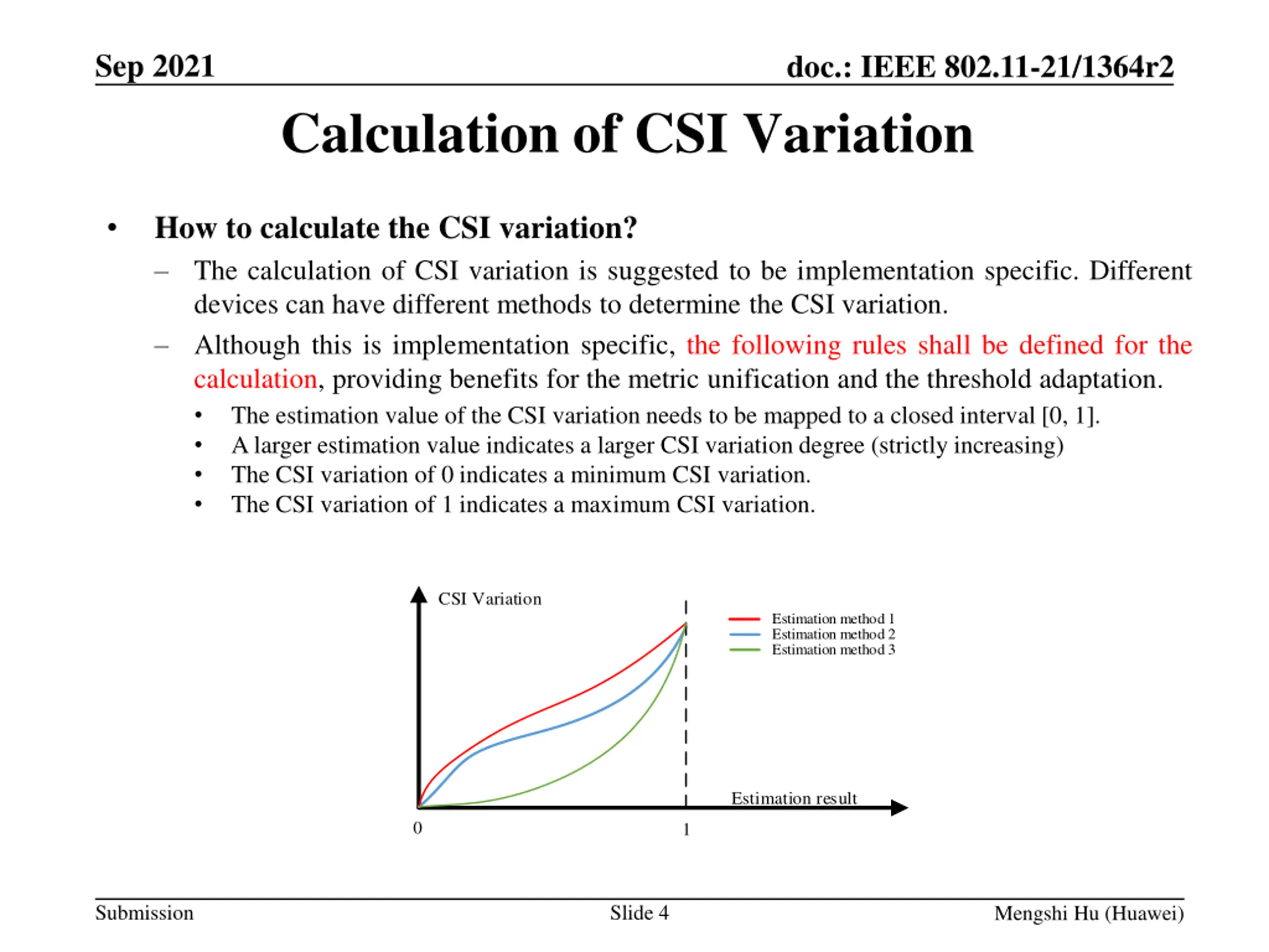 Sep 2021 doc.: IEEE 802.11-21/1364r2 Introduction (2/2) A motion related to the above threshold based procedure has passed [3]: The 11bf amendment defines an optional threshold based measurement and reporting procedure in which The difference between the current measured CSI and the previous measured CSI is quantified. The difference is referred to as CSI variation. A threshold value to be used by the sensing receiver in the threshold based procedure is defined. By comparing the CSI variation with the threshold, the sensing receiver can send a feedback resulting from the large CSI variation to the sensing transmitter. Whether the threshold is predefined, or defined by the sensing receiver, transmitter, initiator or responder is TBD. The threshold based procedure is not always required (Procedure A in 21/0351r5 is not always required). In the subsequent slides, we further give the following details of this optional threshold based sensing. How to calculate the CSI variation Details of the threshold based procedure Submission Slide 3 Mengshi Hu (Huawei)