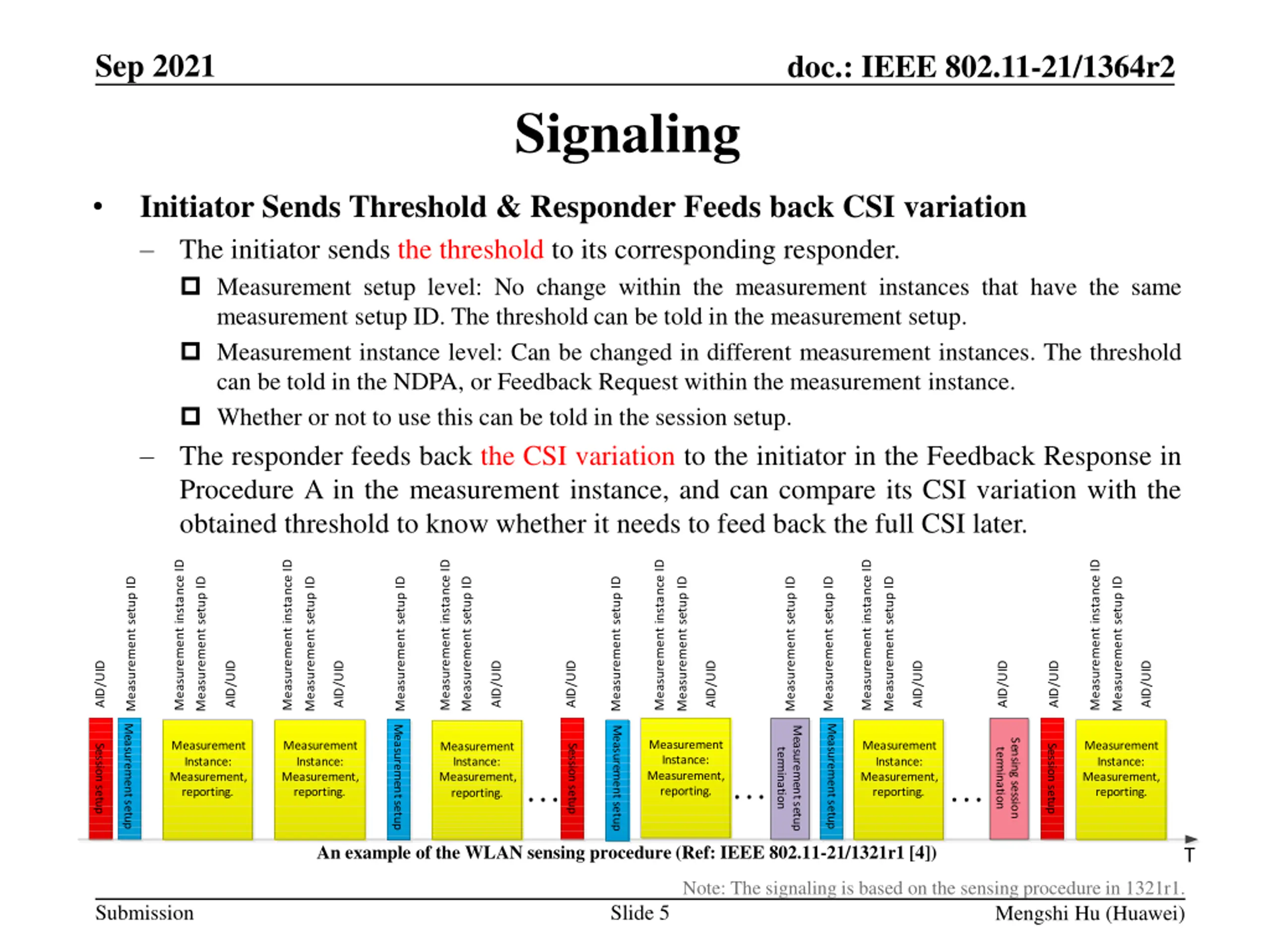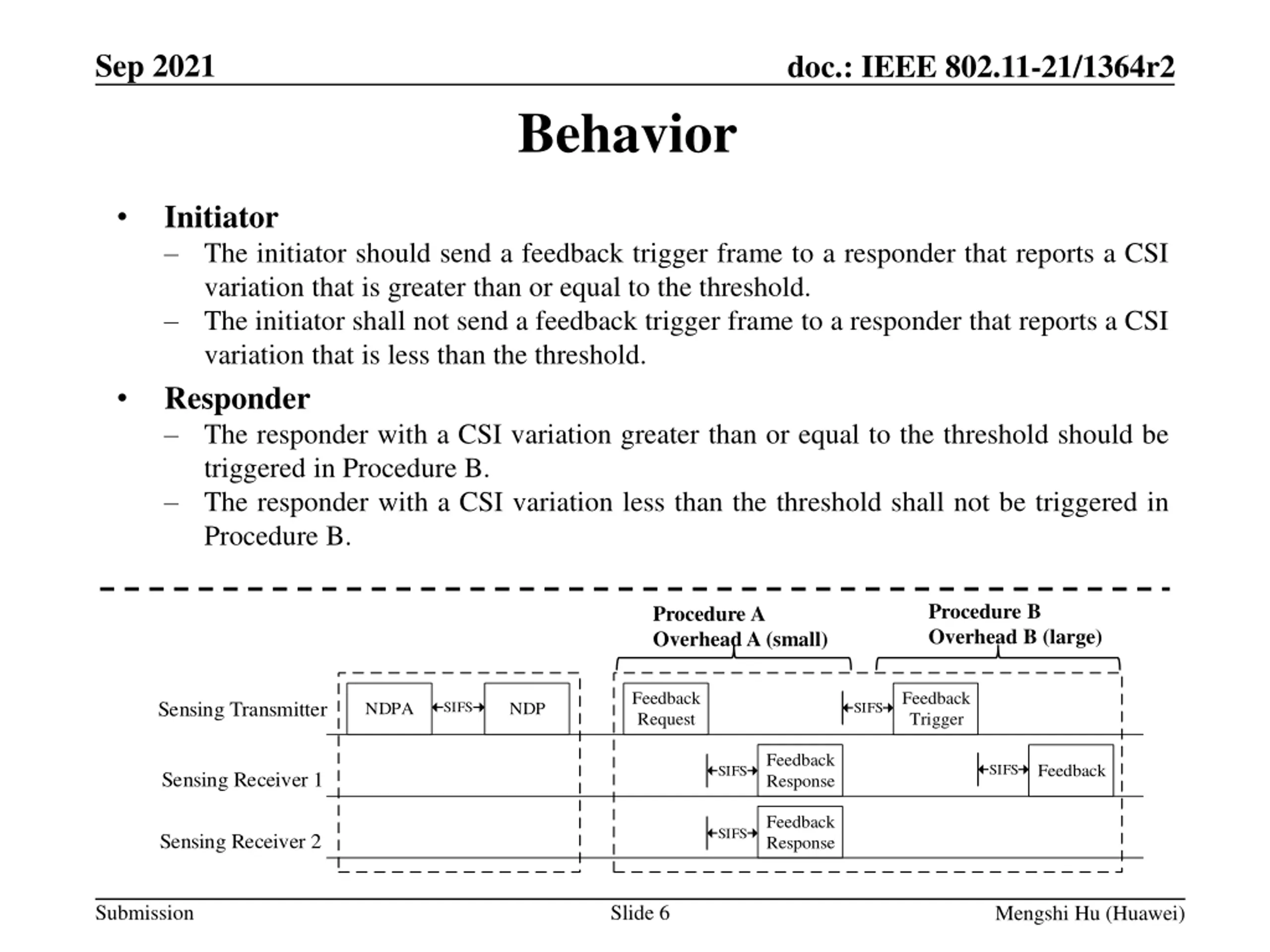 Sep 2021 doc.: IEEE 802.11-21/1364r2 Signaling Initiator Sends Threshold & Responder Feeds back CSI variation The initiator sends the threshold to its corresponding responder. Measurement setup level: No change within the measurement instances that have the same measurement setup ID. The threshold can be told in the measurement setup. Measurement instance level: Can be changed in different measurement instances. The threshold can be told in the NDPA, or Feedback Request within the measurement instance. Whether or not to use this can be told in the session setup. The responder feeds back the CSI variation to the initiator in the Feedback Response in Procedure A in the measurement instance, and can compare its CSI variation with the obtained threshold to know whether it needs to feed back the full CSI later. Measurement instance ID Measurement instance ID Measurement instance ID Measurement instance ID Measurement instance ID Measurement instance ID Measurement setup ID Measurement setup ID Measurement setup ID Measurement setup ID Measurement setup ID Measurement setup ID Measurement setup ID Measurement setup ID Measurement setup ID Measurement setup ID Measurement setup ID AID/UID AID/UID AID/UID AID/UID AID/UID AID/UID AID/UID AID/UID AID/UID AID/UID Measurement setup Measurement setup Measurement setup Measurement setup Measurement setup Sensing session Measurement Instance: Measurement, reporting. Measurement Instance: Measurement, reporting. Measurement Instance: Measurement, reporting. Measurement Instance: Measurement, reporting. Measurement Instance: Measurement, reporting. Measurement Instance: Measurement, reporting. Session setup Session setup Session setup termination termination . . . . . . . . . An example of the WLAN sensing procedure (Ref: IEEE 802.11-21/1321r1 [4]) T Note: The signaling is based on the sensing procedure in 1321r1. Submission Slide 5 Mengshi Hu (Huawei)
