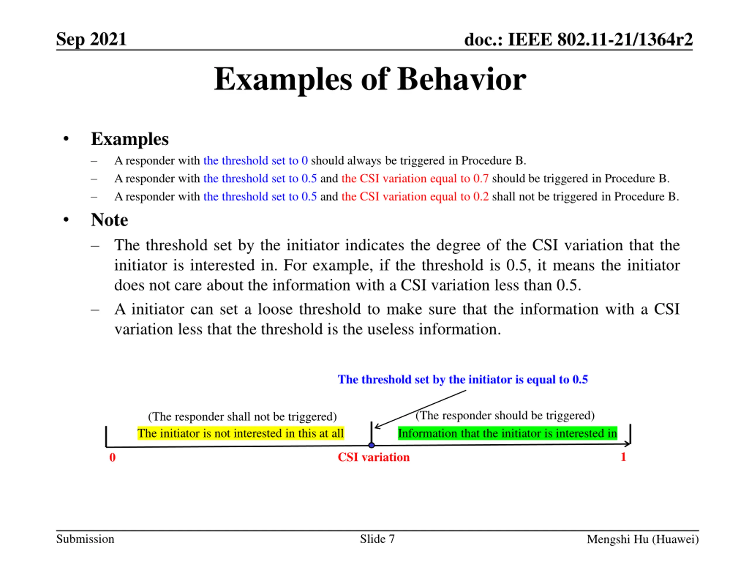 Sep 2021 doc.: IEEE 802.11-21/1364r2 Behavior Initiator The initiator should send a feedback trigger frame to a responder that reports a CSI variation that is greater than or equal to the threshold. The initiator shall not send a feedback trigger frame to a responder that reports a CSI variation that is less than the threshold. Responder The responder with a CSI variation greater than or equal to the threshold should be triggered in Procedure B. The responder with a CSI variation less than the threshold shall not be triggered in Procedure B. Procedure B Overhead B (large) Procedure A Overhead A (small) Feedback Request Feedback Trigger Sensing Transmitter NDPA NDP SIFS SIFS Feedback Response Feedback SIFS SIFS Sensing Receiver 1 Feedback Response SIFS Sensing Receiver 2 Submission Slide 6 Mengshi Hu (Huawei)