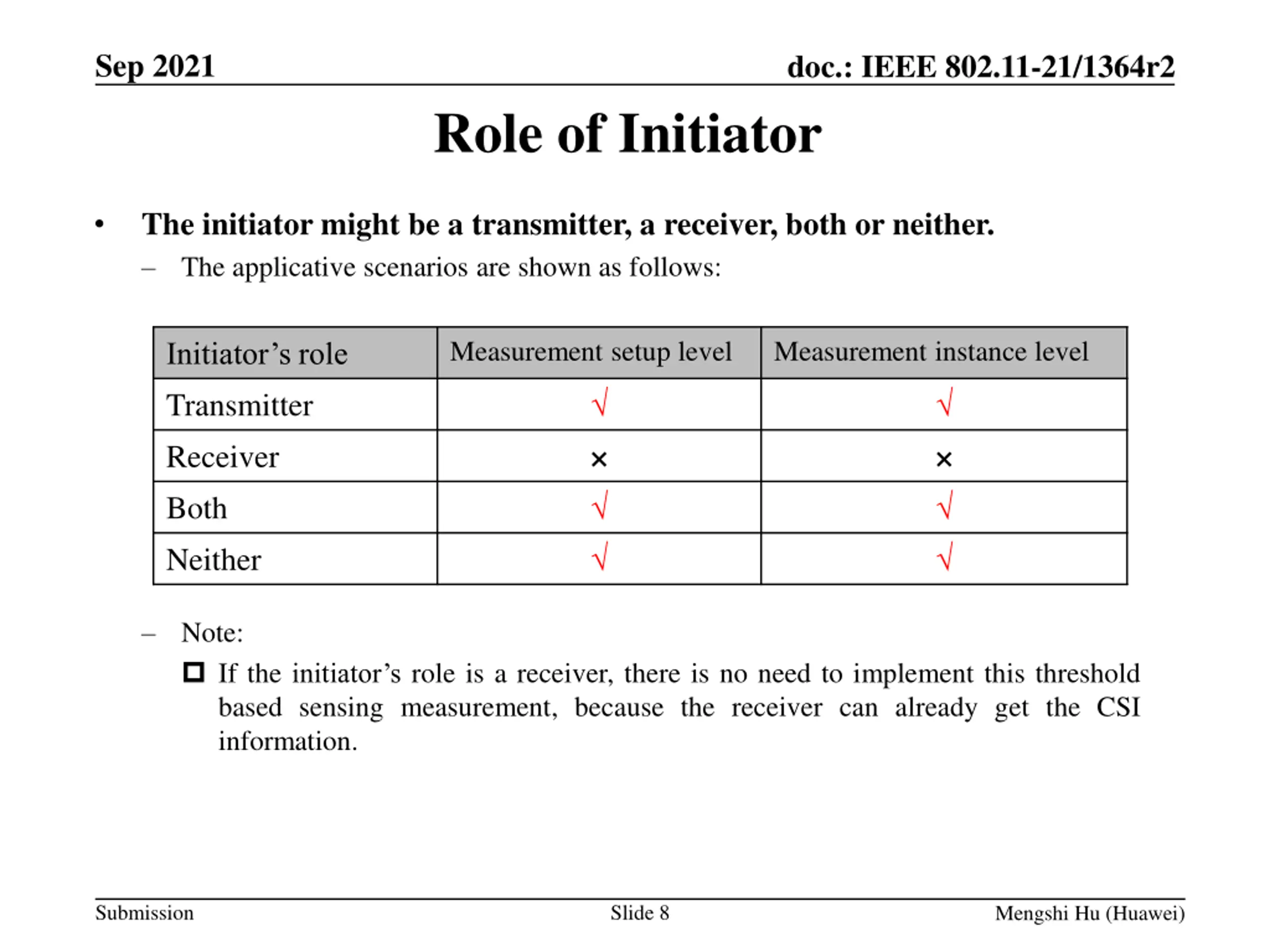 Sep 2021 doc.: IEEE 802.11-21/1364r2 Role of Initiator The initiator might be a transmitter, a receiver, both or neither. The applicative scenarios are shown as follows: Measurement setup level Measurement instance level Initiator s role Transmitter Receiver Both Neither Note: If the initiator s role is a receiver, there is no need to implement this threshold based sensing measurement, because the receiver can already get the CSI information. Submission Slide 8 Mengshi Hu (Huawei)