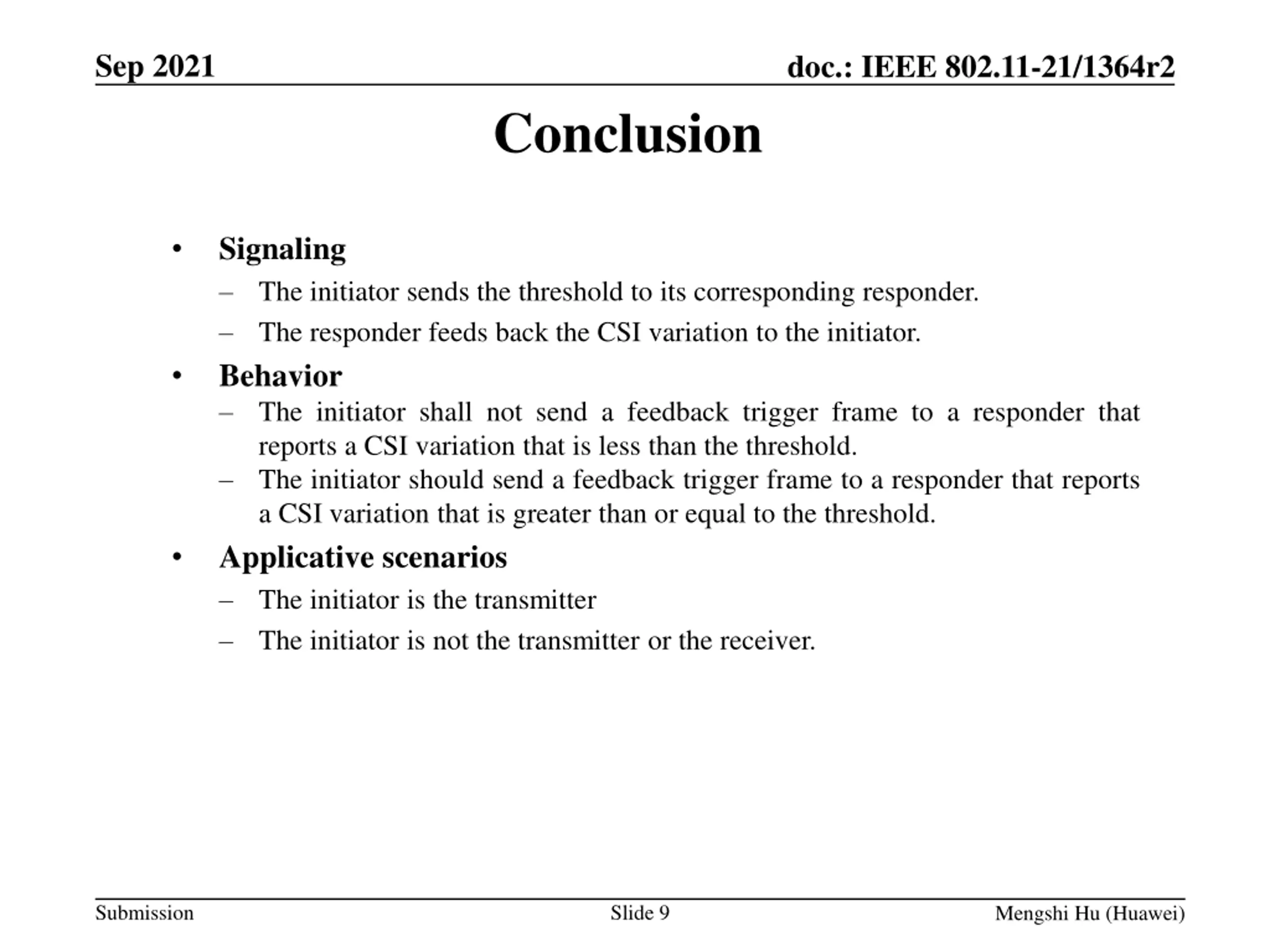 Sep 2021 doc.: IEEE 802.11-21/1364r2 Conclusion Signaling The initiator sends the threshold to its corresponding responder. The responder feeds back the CSI variation to the initiator. Behavior The initiator shall not send a feedback trigger frame to a responder that reports a CSI variation that is less than the threshold. The initiator should send a feedback trigger frame to a responder that reports a CSI variation that is greater than or equal to the threshold. Applicative scenarios The initiator is the transmitter The initiator is not the transmitter or the receiver. Submission Slide 9 Mengshi Hu (Huawei)
