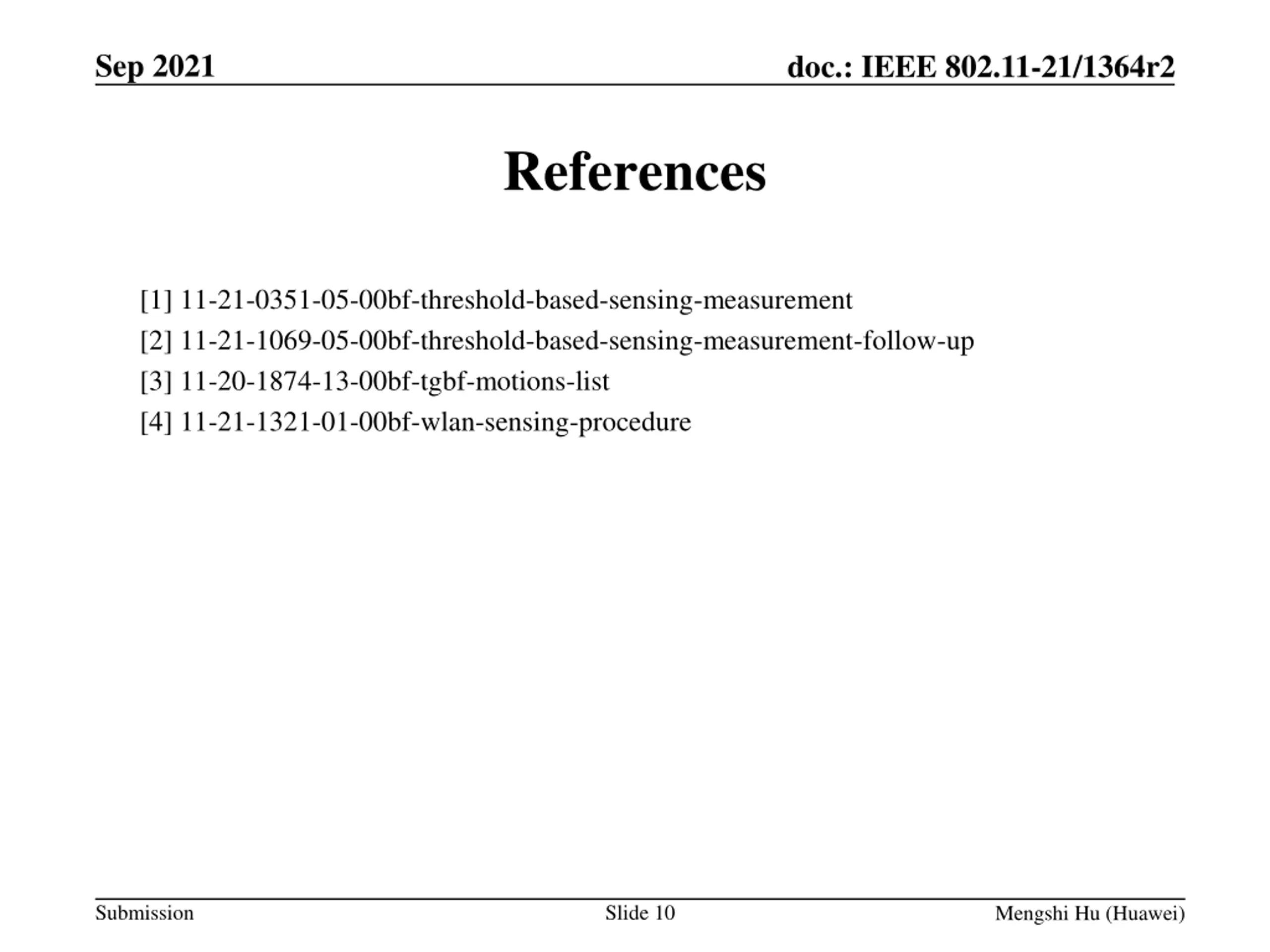 Sep 2021 doc.: IEEE 802.11-21/1364r2 References [1] 11-21-0351-05-00bf-threshold-based-sensing-measurement [2] 11-21-1069-05-00bf-threshold-based-sensing-measurement-follow-up [3] 11-20-1874-13-00bf-tgbf-motions-list [4] 11-21-1321-01-00bf-wlan-sensing-procedure Submission Slide 10 Mengshi Hu (Huawei)
