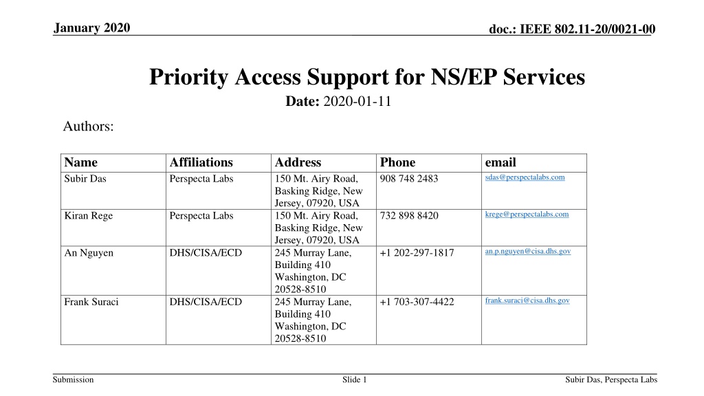 January 2020 doc.: IEEE 802.11-20/0021-00 Priority Access Support for NS/EP Services Date: 2020-01-11 Authors: Name Subir Das Affiliations Perspecta Labs Address 150 Mt. Airy Road, Basking Ridge, New Jersey, 07920, USA 150 Mt. Airy Road, Basking Ridge, New Jersey, 07920, USA 245 Murray Lane, Building 410 Washington, DC 20528-8510 245 Murray Lane, Building 410 Washington, DC 20528-8510 Phone 908 748 2483 email sdas@perspectalabs.com Kiran Rege Perspecta Labs 732 898 8420 krege@perspectalabs.com An Nguyen DHS/CISA/ECD +1 202-297-1817 an.p.nguyen@cisa.dhs.gov Frank Suraci DHS/CISA/ECD +1 703-307-4422 frank.suraci@cisa.dhs.gov Submission Slide 1 Subir Das, Perspecta Labs