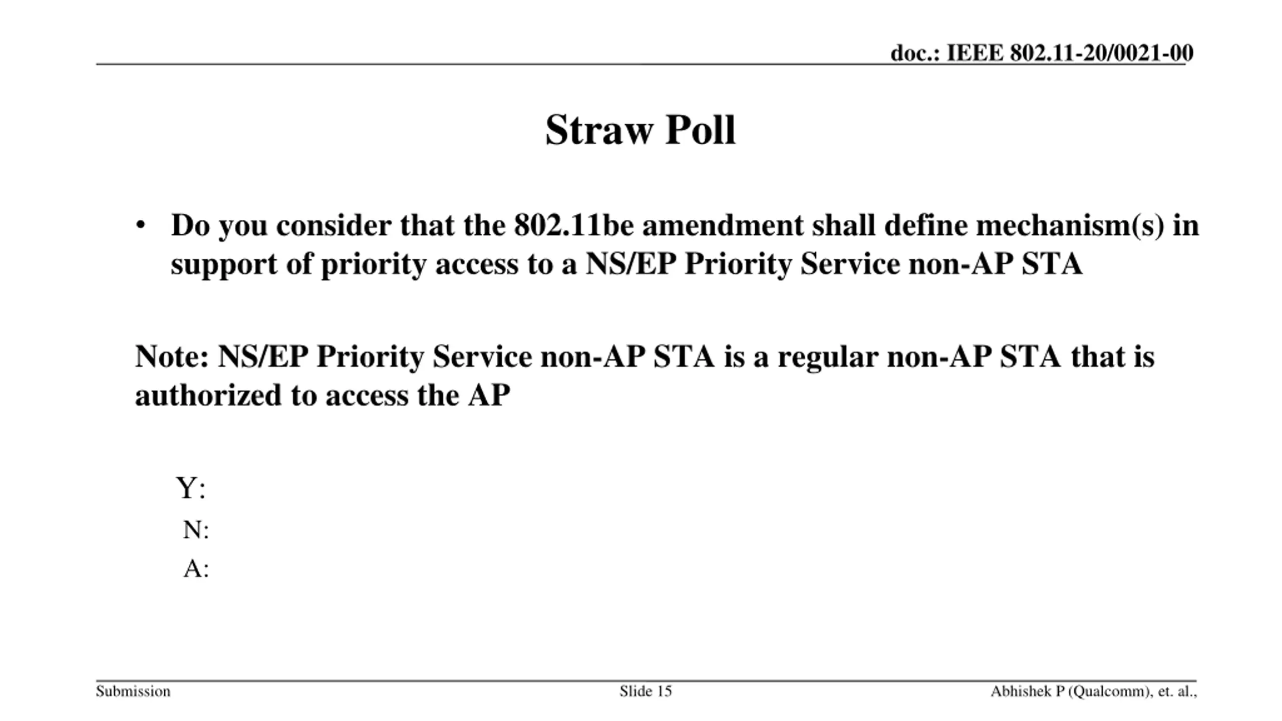 doc.: IEEE 802.11-20/0021-00 Straw Poll Do you consider that the 802.11be amendment shall define mechanism(s) in support of priority access to a NS/EP Priority Service non-AP STA Note: NS/EP Priority Service non-AP STA is a regular non-AP STA that is authorized to access the AP Y: N: A: Submission Slide 15 Abhishek P (Qualcomm), et. al.,